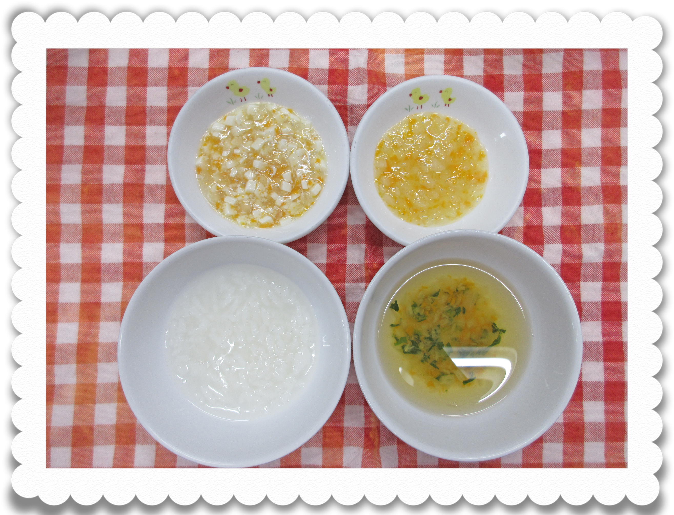 午前食:全粥、豆腐のそぼろみそ煮、野菜煮、青菜スープ