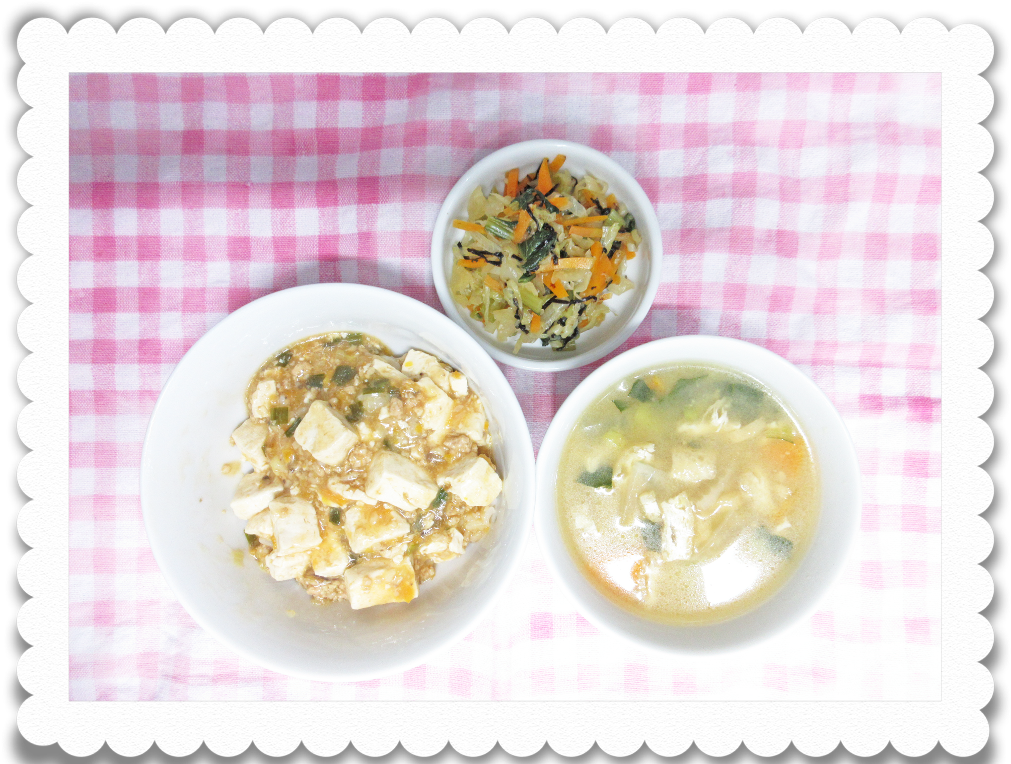 午前食:硬粥、マーボー豆腐風、青菜スープ、和風あえ
