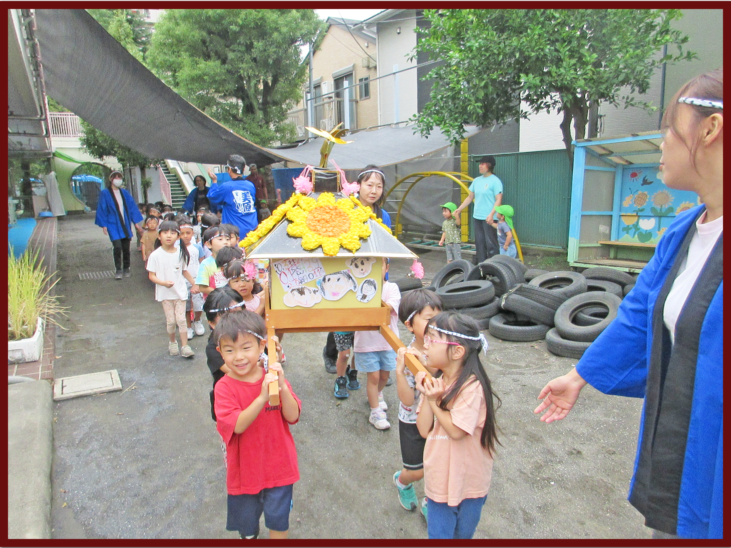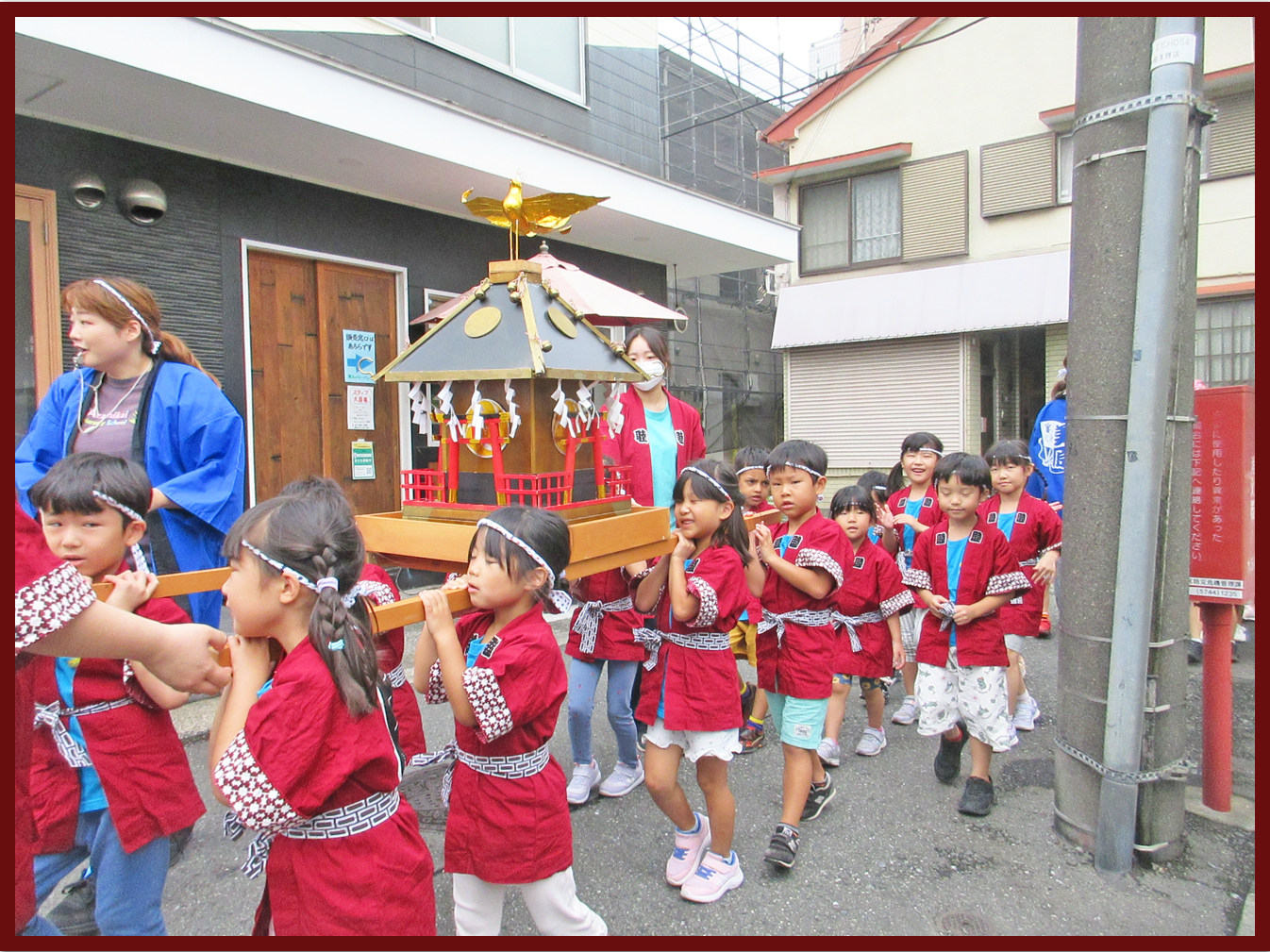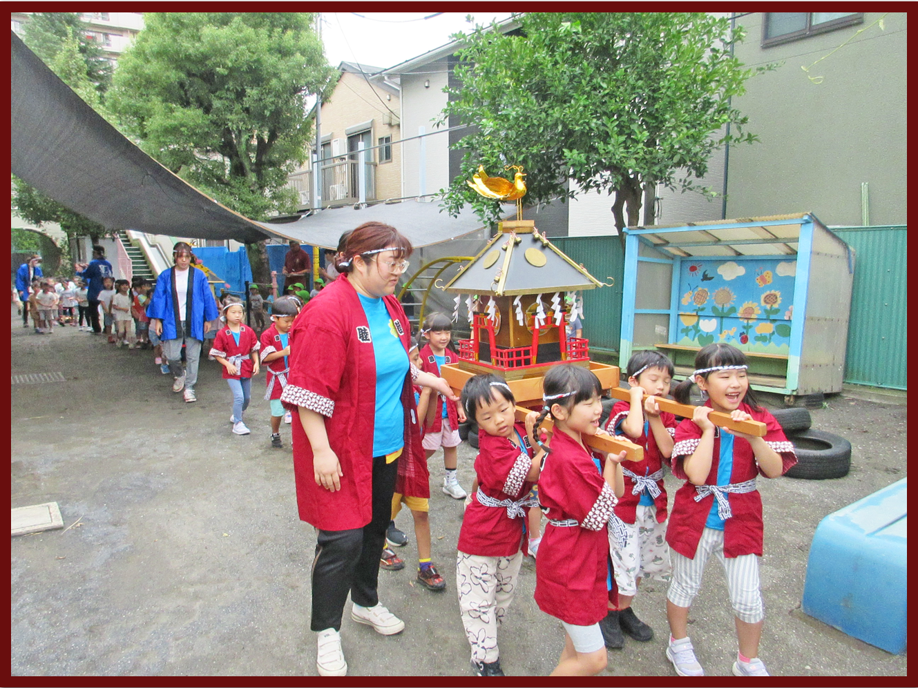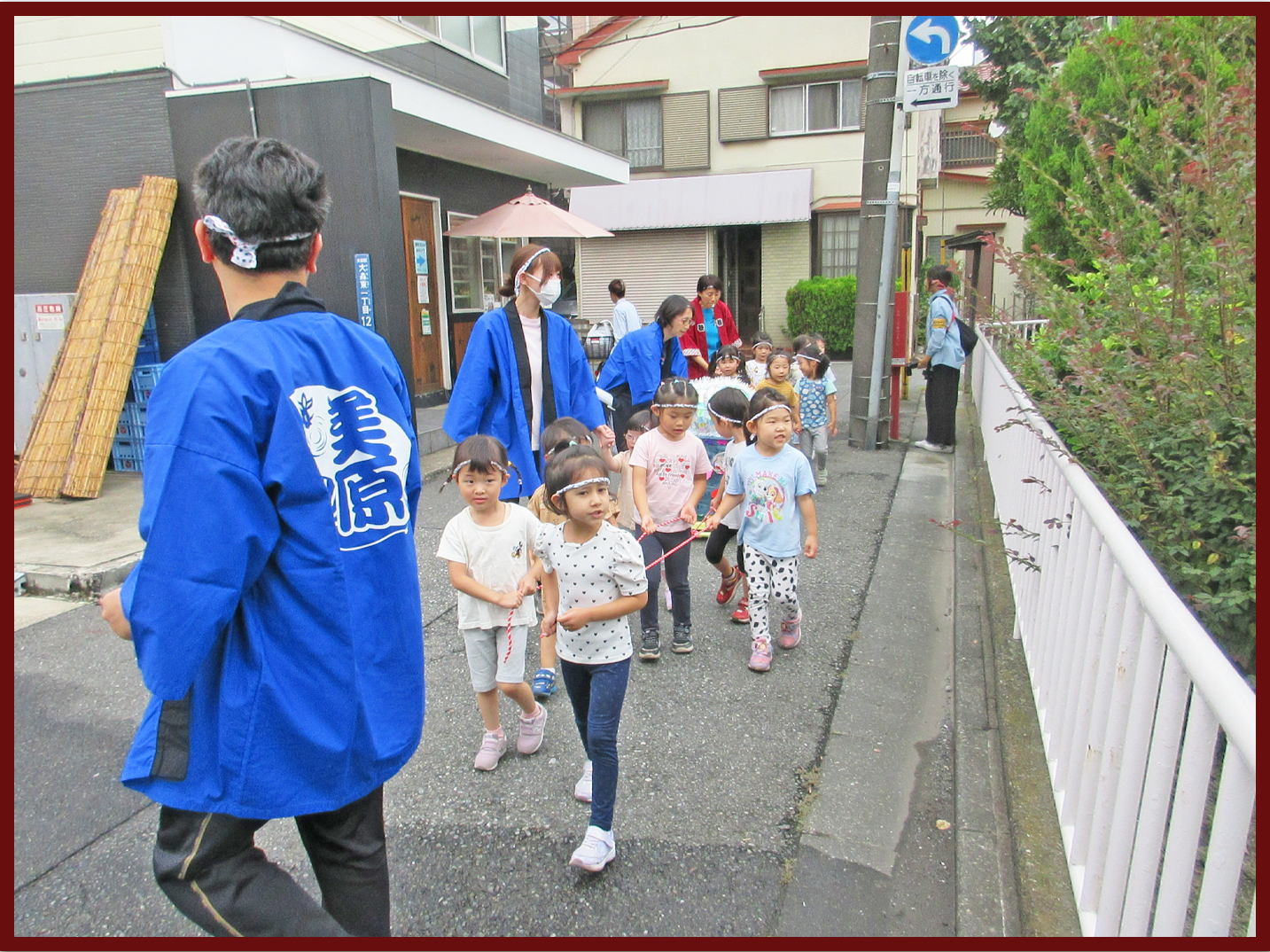 今年度は気候に恵まれ、戸外で『おまつり』を行うことが出来ました。以前から、お神輿や山車作りをしたり、神輿を担いだりして楽しみにしていました。会の前は、それぞれのクラスは支度をして元気に園庭に集まり、担当の先生の話を聞き出発しました。「わっしょい、わっしょい」と気合を入れた大きな声で掛け声をかけ園周辺を練り歩くと、小さいクラスの友だちや保護者の方々の声援も聞こえ、嬉しそうな表情や手を振って声援に返答している姿も見られました。