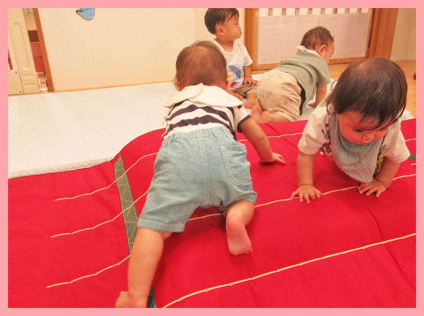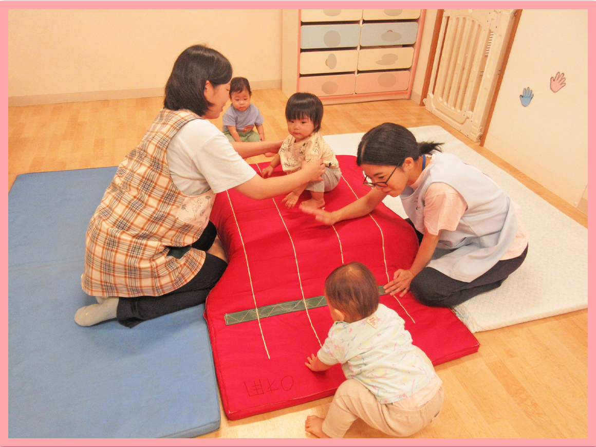 室内ではマットの山を出すと、四つ這いで上り下りを楽しんでいました。ごろんとマットに寝転がりくつろぐ姿も見られ、保育者にくすぐられると声を出して笑っていました。マットへ仰向けに寝転び、保育者がゆっくり前や後ろに動かすと心地よさそうにしていました。