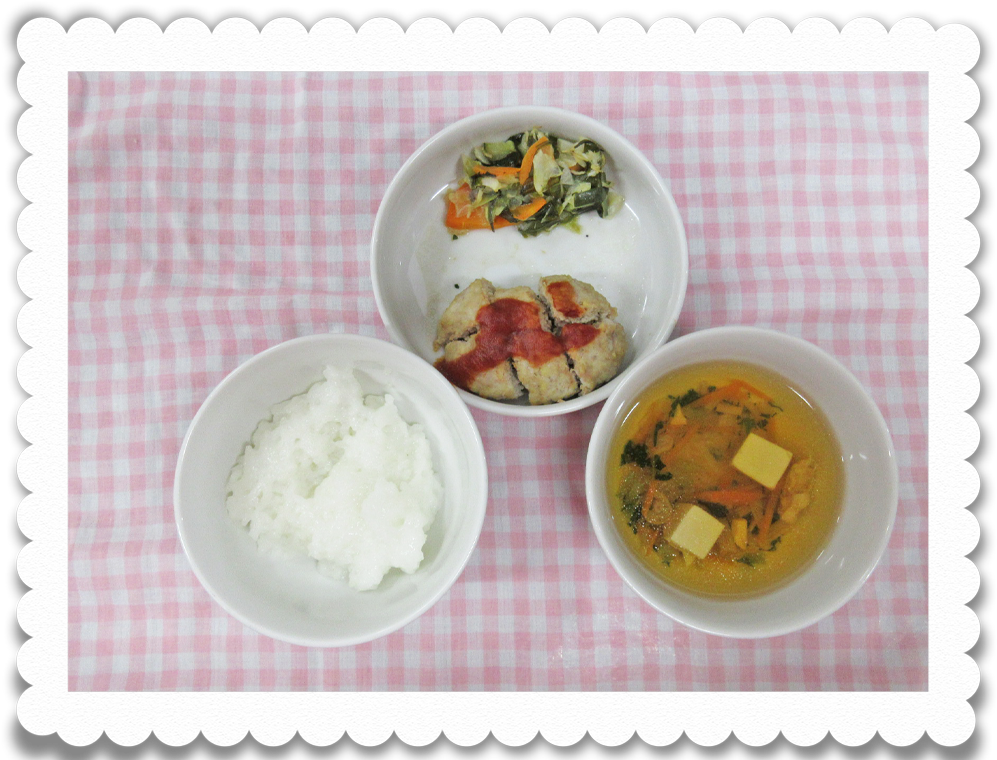 午前食: 硬粥、煮込みハンバーグ、わかめサラダ、豆腐スープ