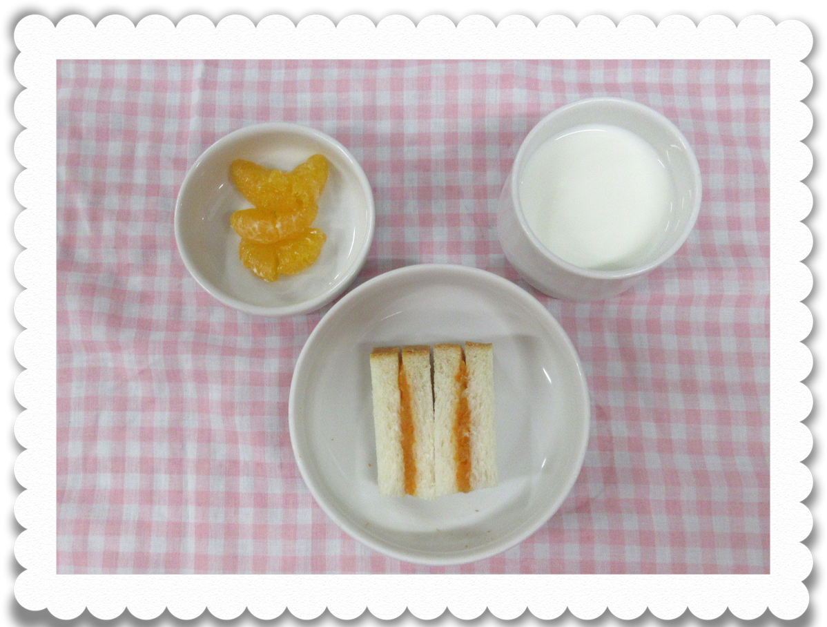 【幼児おやつ】牛乳、人参ジャムサンド、果物