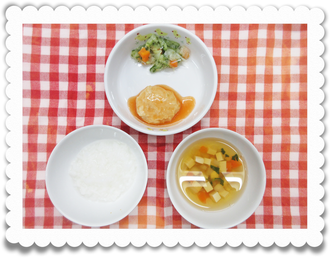午前食:全粥、鶏ささみのくず煮、おろし煮、豆腐スープ