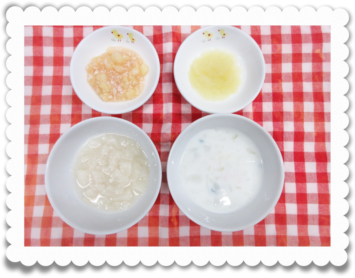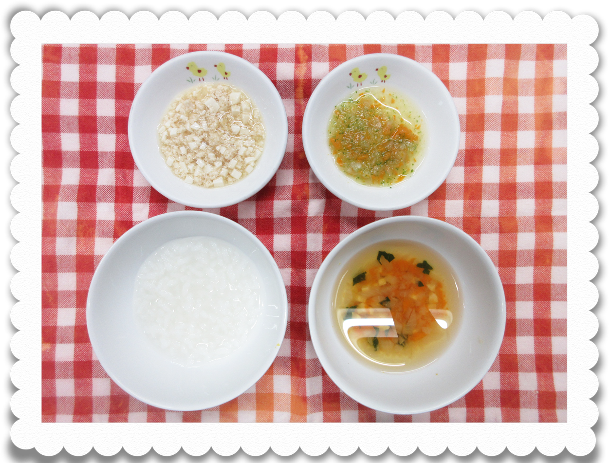 午前食:10倍粥、マッシュポテト、キャベツと人参のうらごし、野菜スープ
