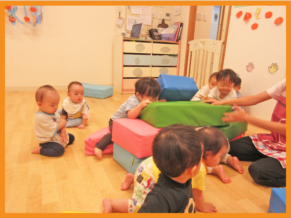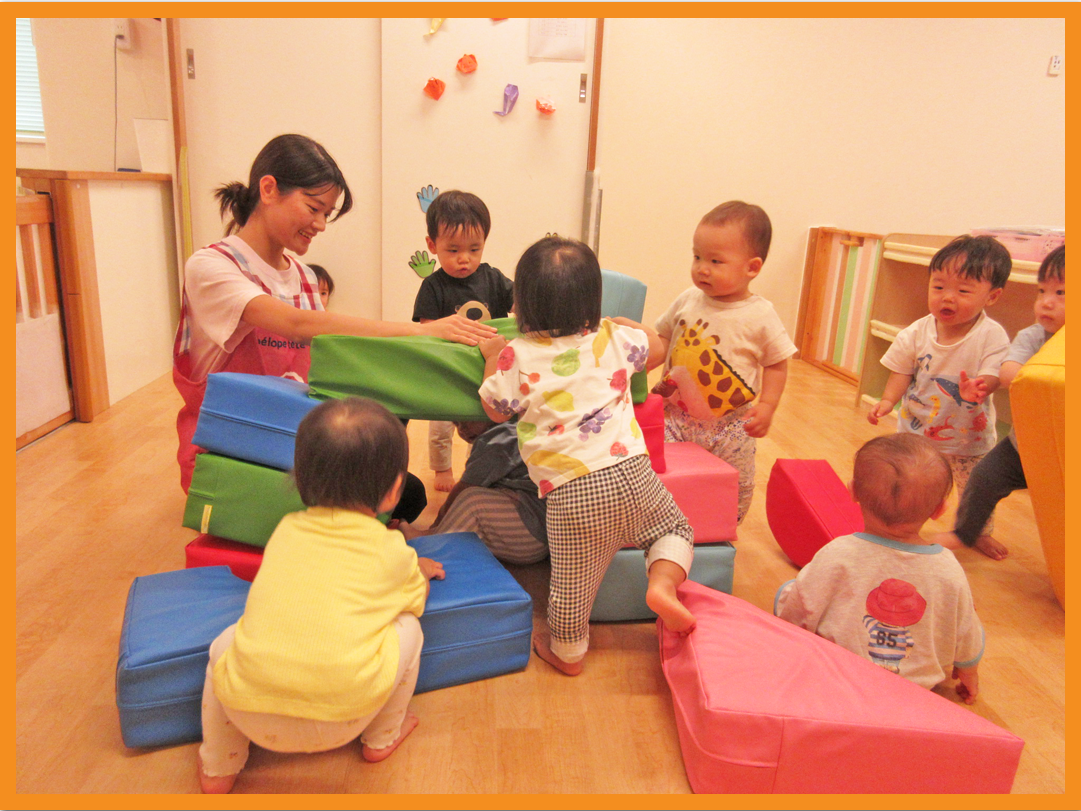 またその後、ソフトブロックでトンネルを作ると、嬉しそうにこどもたちがトンネルの前に集まり、トンネルを何度もくぐったり、トンネルを崩したりする遊びを楽しんでいました。