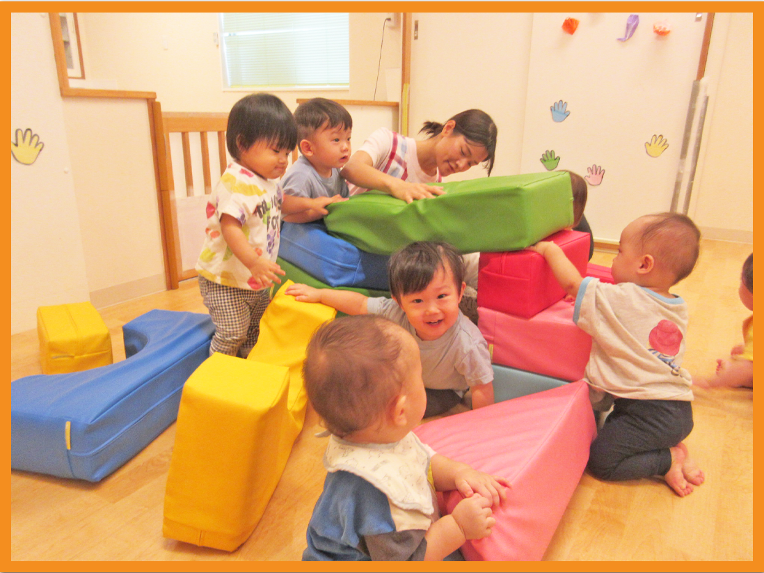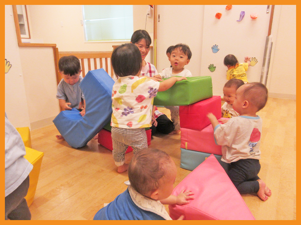 今日は、室内でソフトブロック遊びをしました。保育者が「おおきなたいこ」を歌いながら
