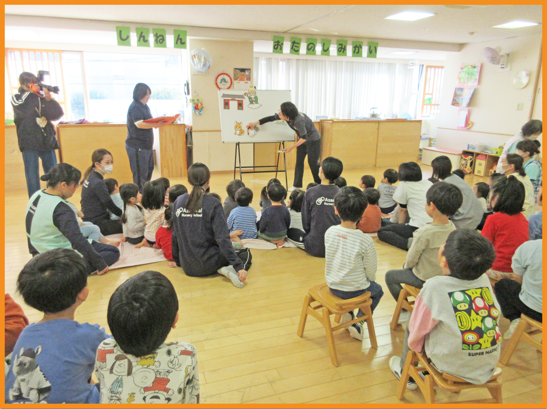 新年お楽しみ会を行い、初めに十二支の成り立ちに関するパネルシアターをしました。十二支の順番を覚えているこどもも多く「つぎは、〇〇だよ」と、教えてくれる姿が見られました。お正月クイズでも、質問の内容が面白かったようで大笑いで最後まで楽しみました。乳児クラスのお友達は、各クラスでミニ獅子舞と触れ合いました。