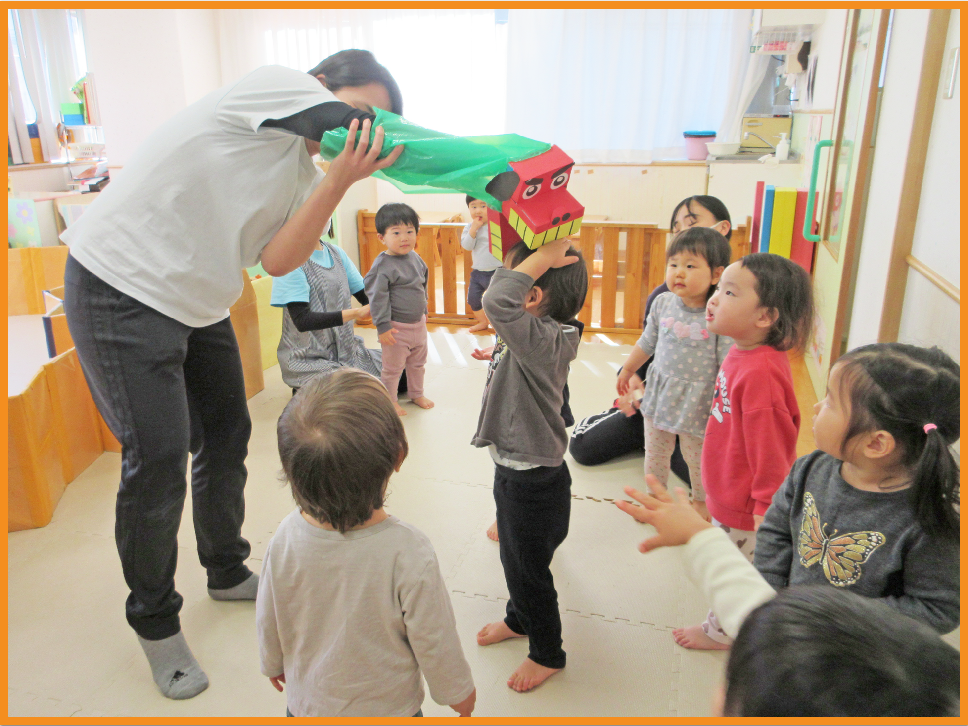 幼児クラスのお友達は、大きな獅子舞と接し「あたま、かんでいいよ」と興味津々の様子でした。その後は、各クラスに戻りコマやカルタ等、お正月遊びを行いました。