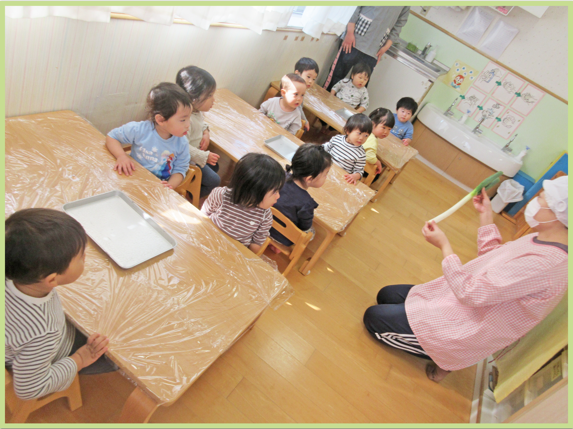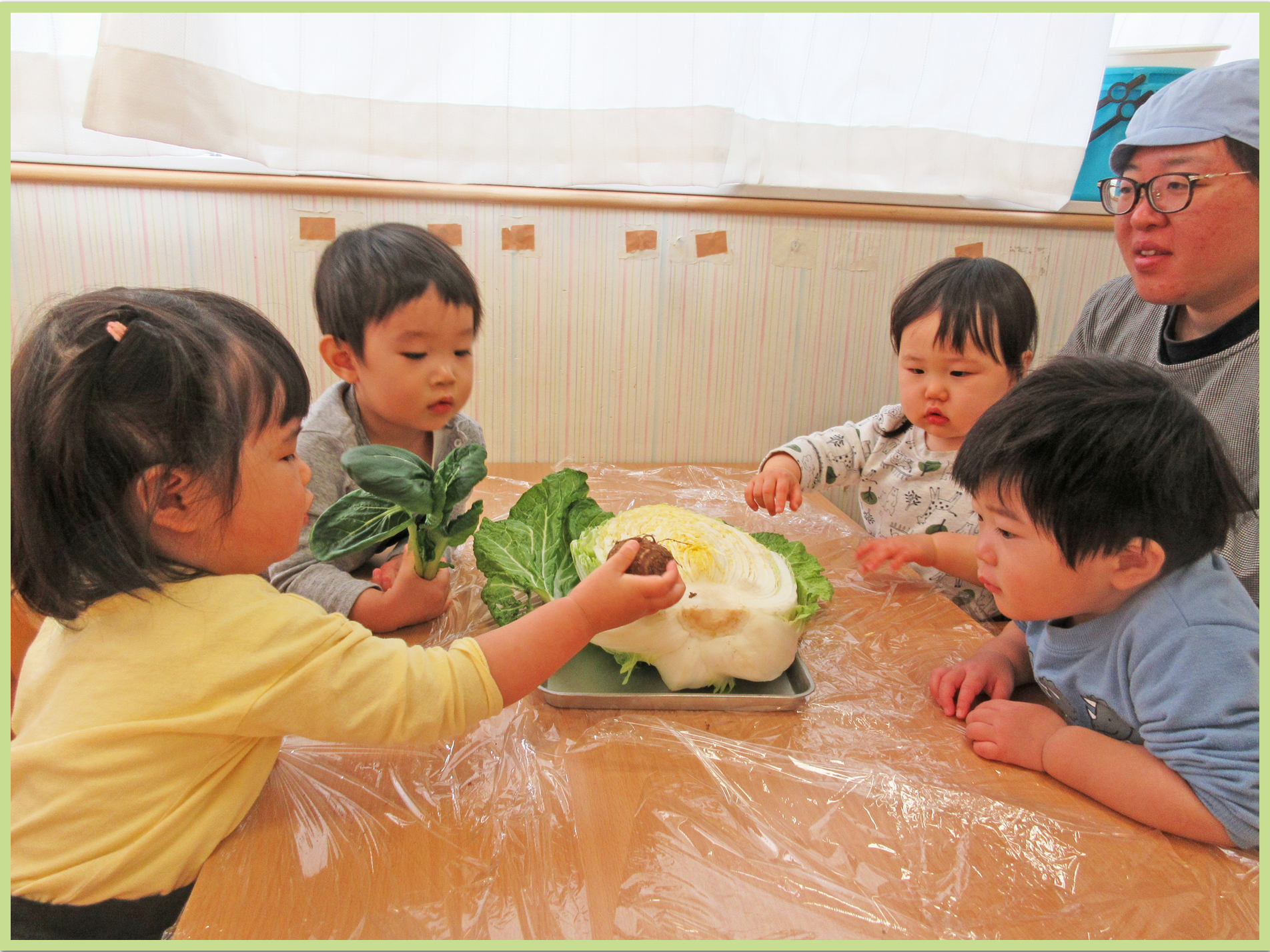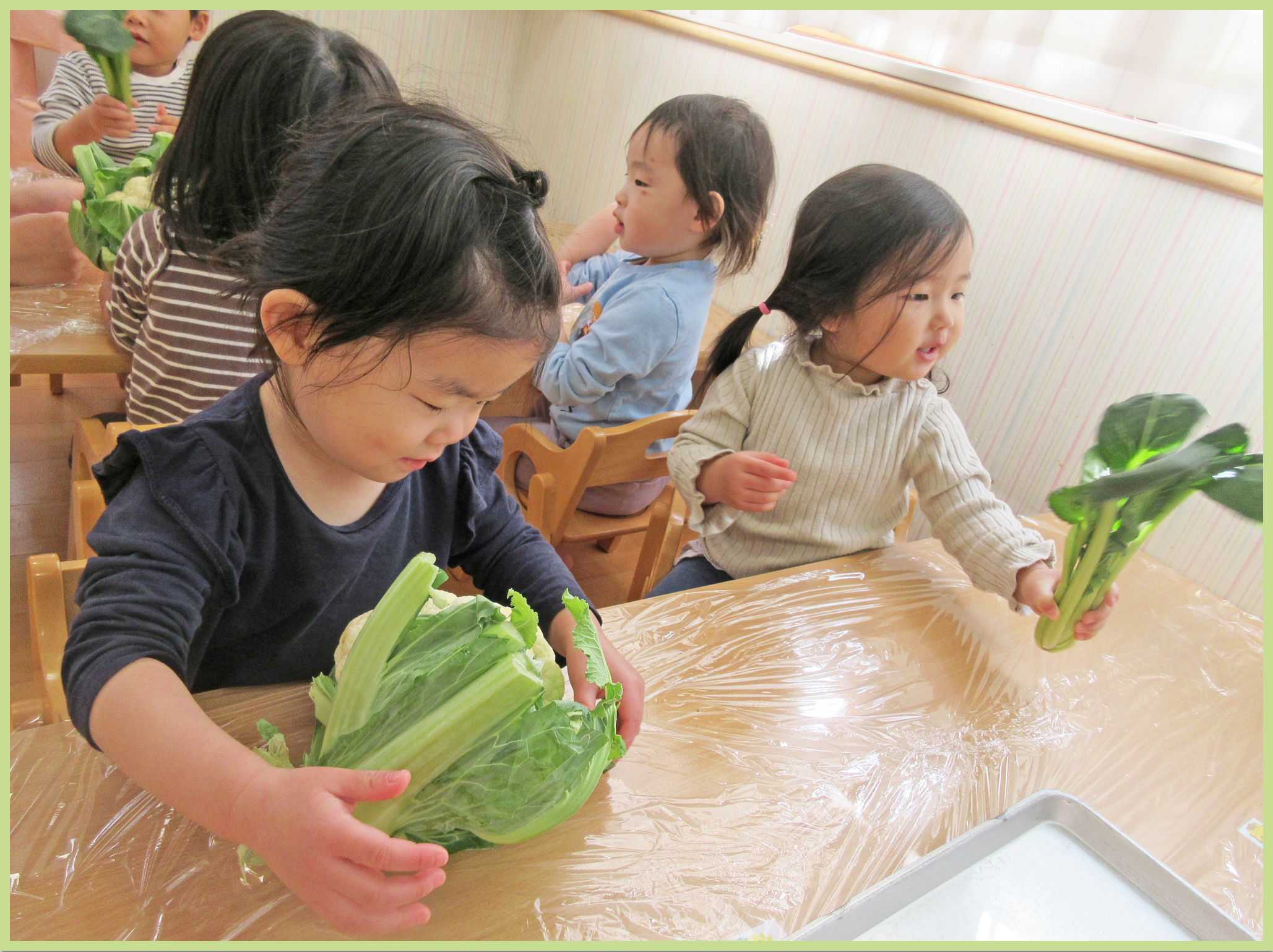 「これは何かわかる」と野菜の名前を聞かれると、似たような食材の名前を答える子が多く、カリフラワーや小松菜、里芋など難しい名前の野菜を教えてもらいました。実際に触ってみると「重たいね」「長いね」「お花みたいだね」などと、触れた感想を伝えられるようになっていたかぜ組さんでした。