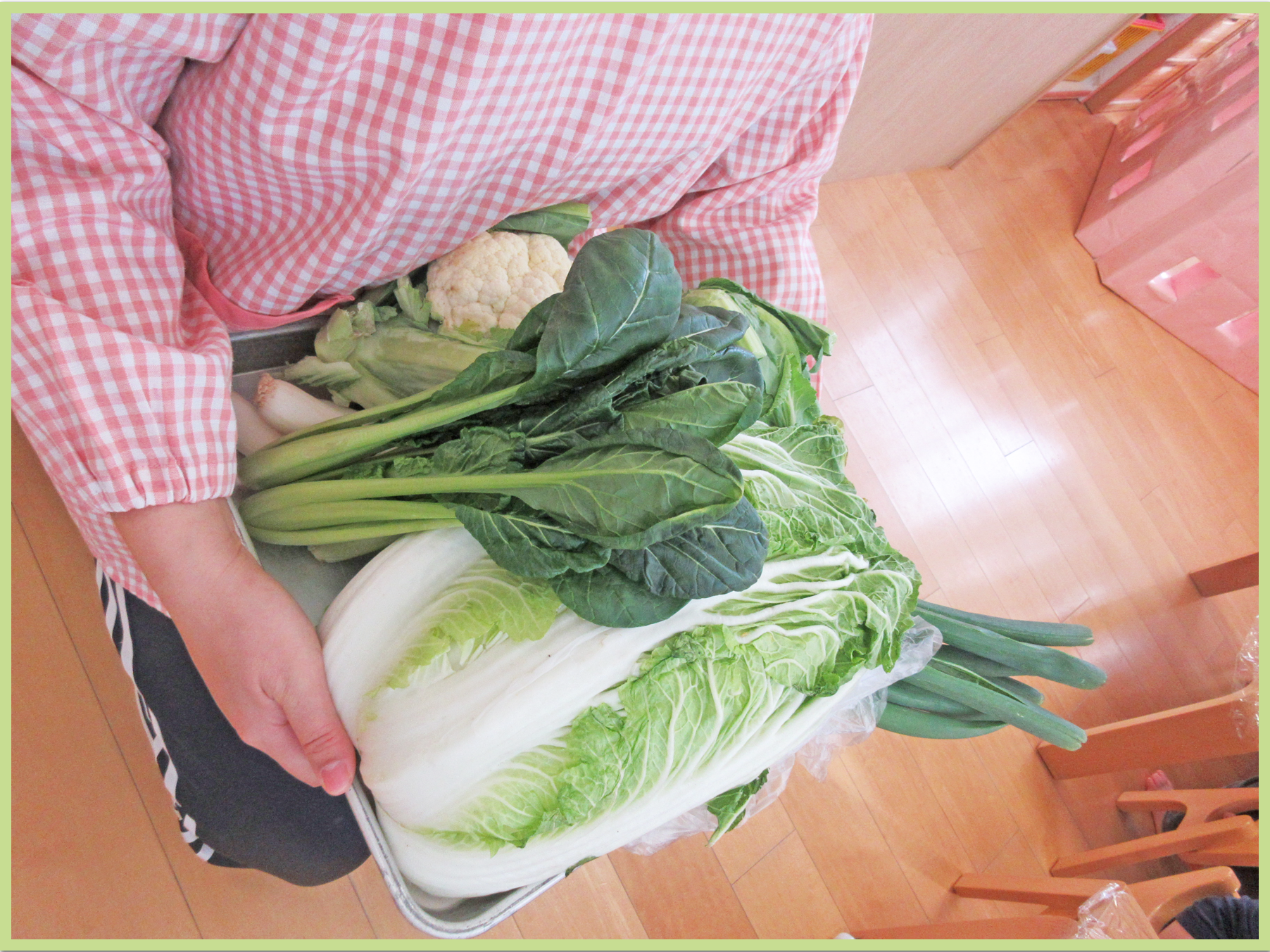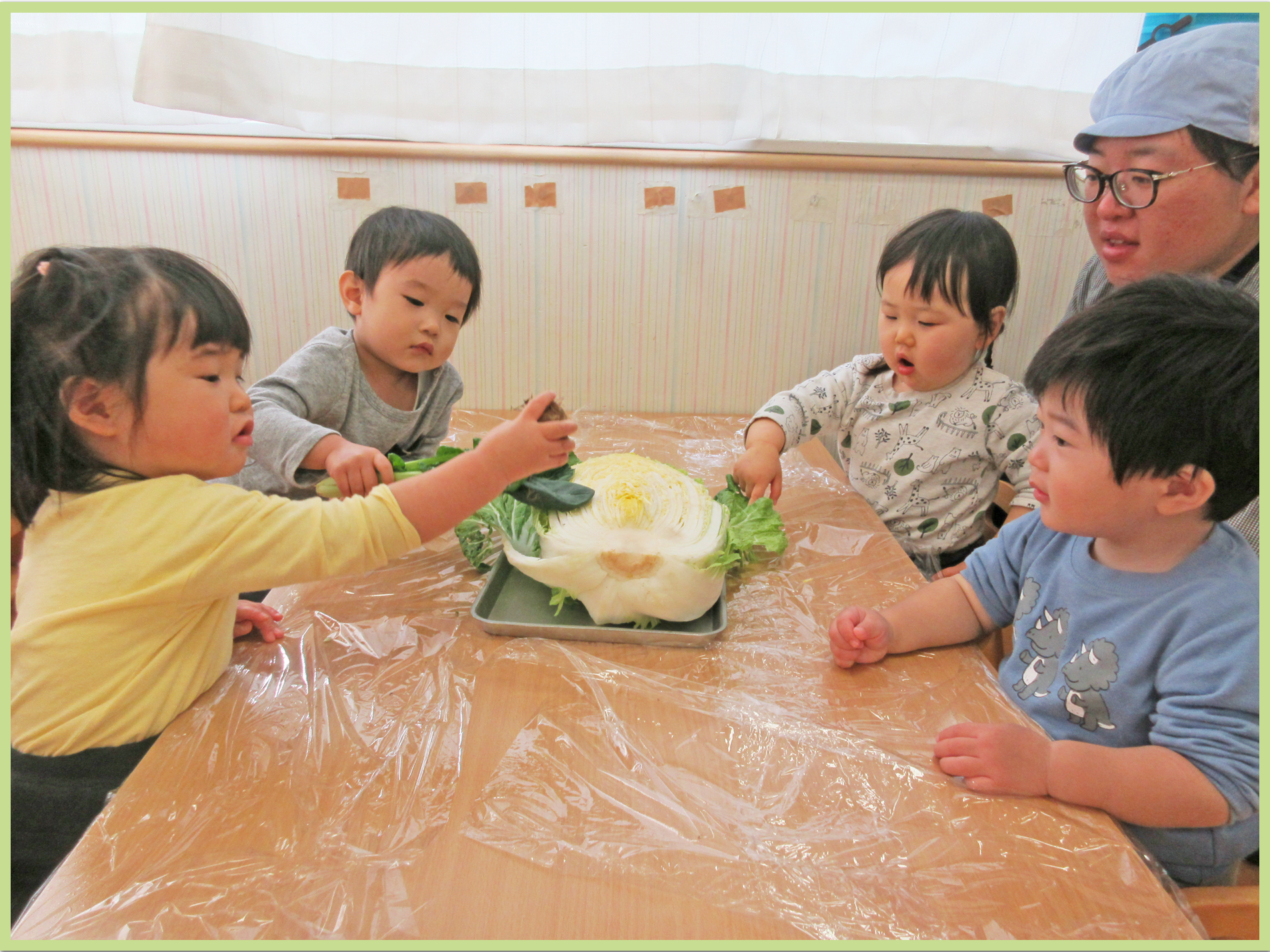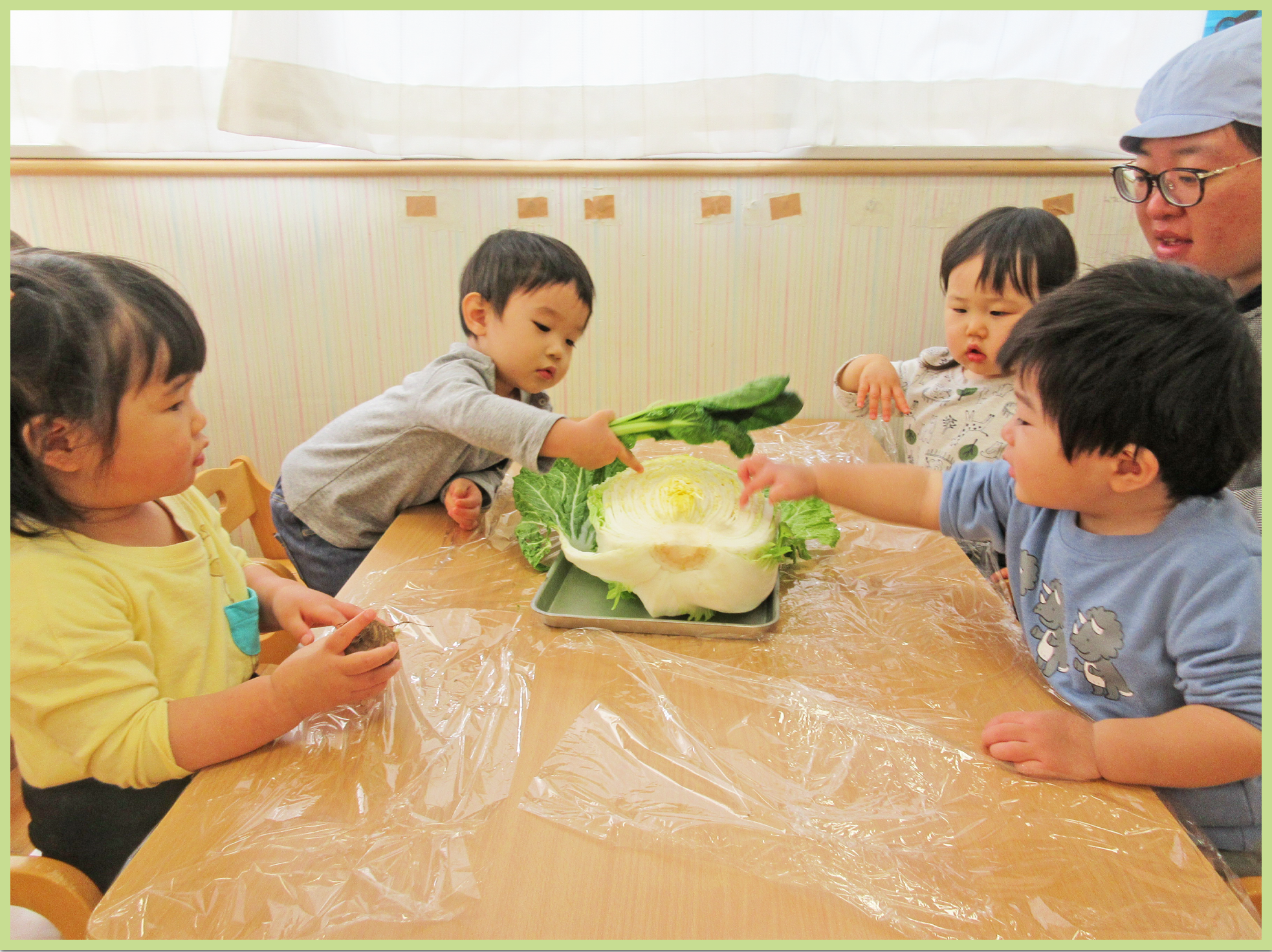 「これは何かわかる」と野菜の名前を聞かれると、似たような食材の名前を答える子が多く、カリフラワーや小松菜、里芋など難しい名前の野菜を教えてもらいました。実際に触ってみると「重たいね」「長いね」「お花みたいだね」などと、触れた感想を伝えられるようになっていたかぜ組さんでした。