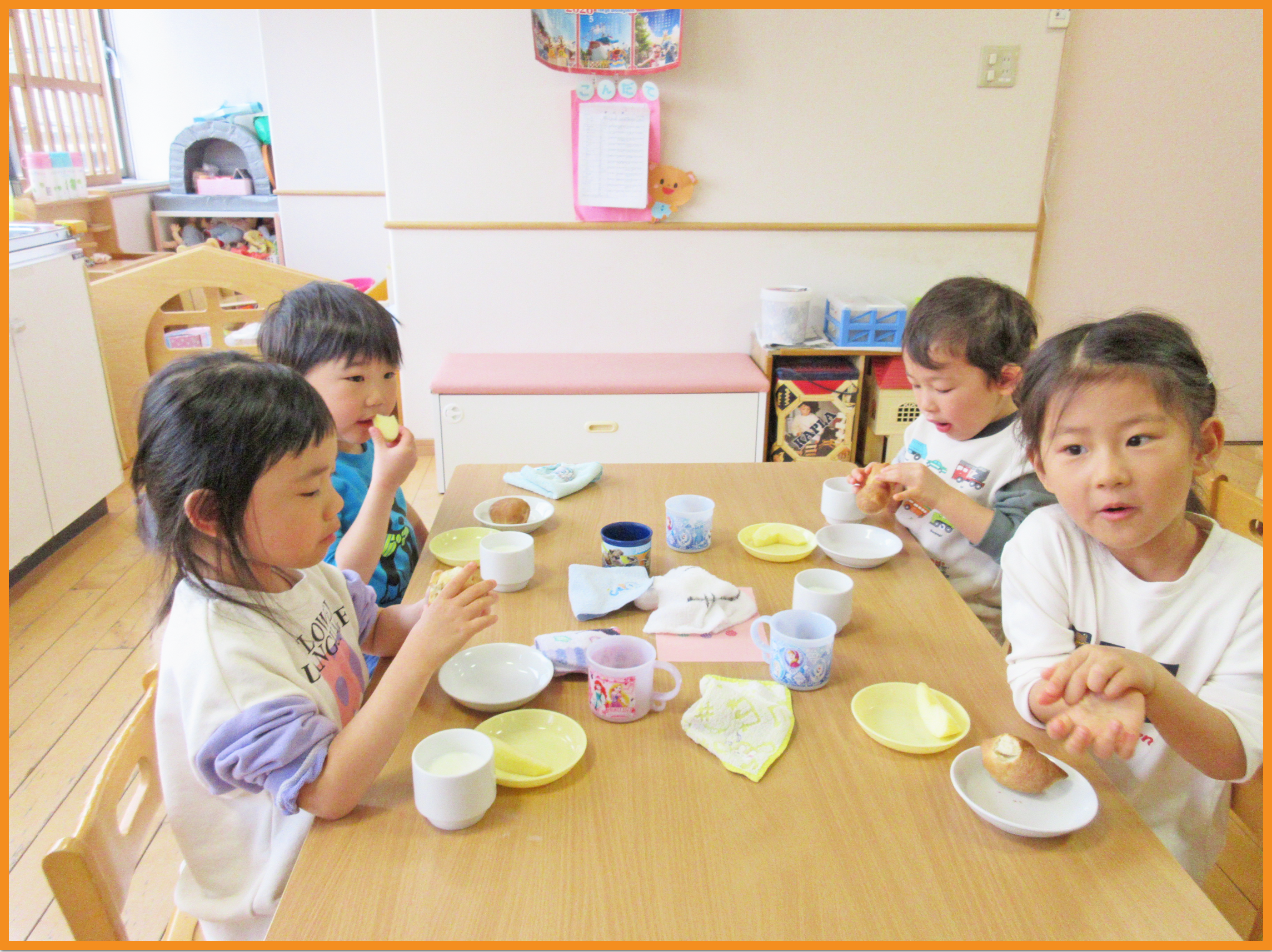 食育でパン作りを行いました。「しょくパン」「くまくまパン」と何のパンを作るかをみんなで話し、とても楽しみにしていたこどもたち。給食の先生の話をとても真剣に聞いて取り組む姿がありました。