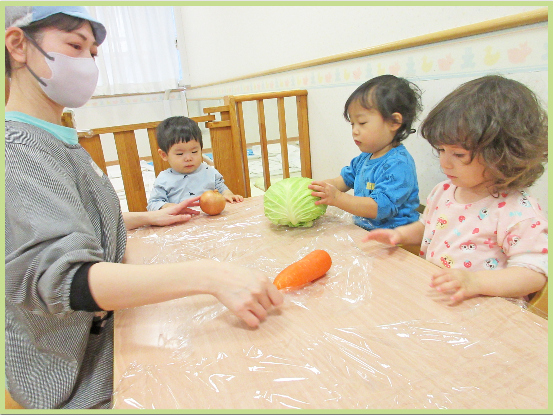初めての食育活動がありました。食材がたくさん出てくる絵本を見ながら食育活動に対する期待感を高めていきました。給食職員が野菜や果物を持ってきて近くで見ると早速触ってみたり、持ち上げてみたり、匂いを嗅いでみたりと興味津々な様子が見られました♪五感を使った貴重な経験が出来、とても楽しそうなこどもたちでした。