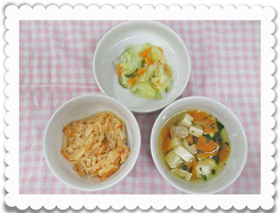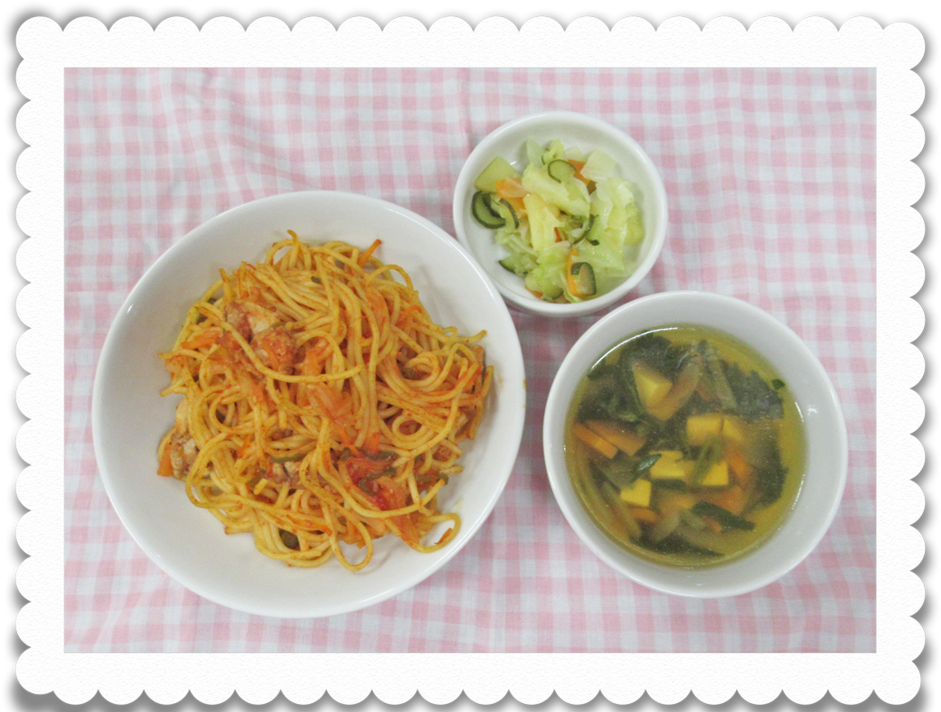 【幼児給食】スパゲティナポリタン、りんごのサラダ、豆腐スープ