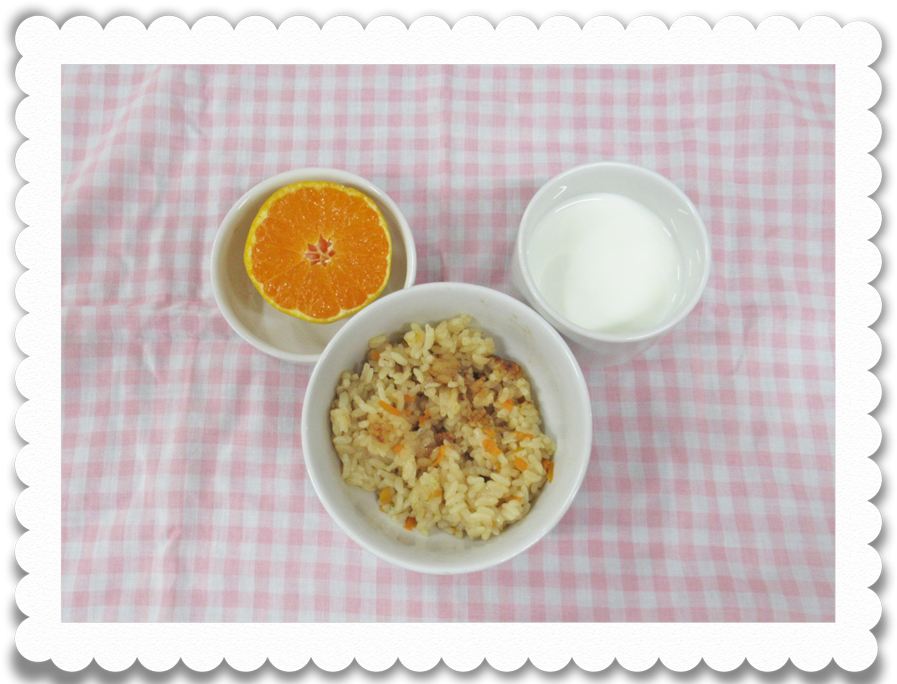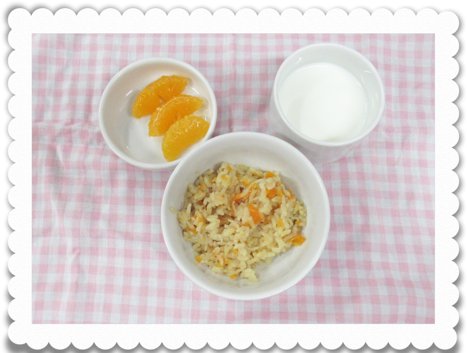 【幼児おやつ】牛乳、人参としらすのご飯、果物