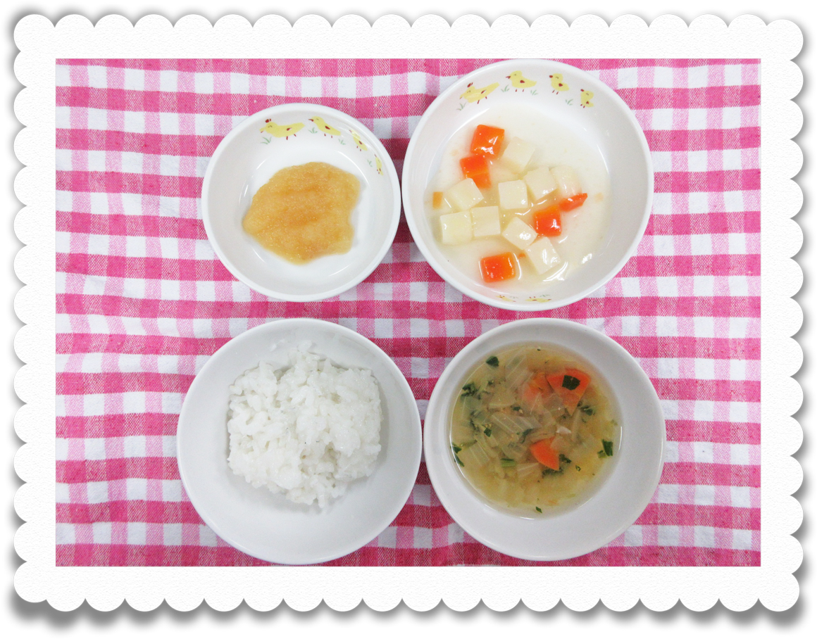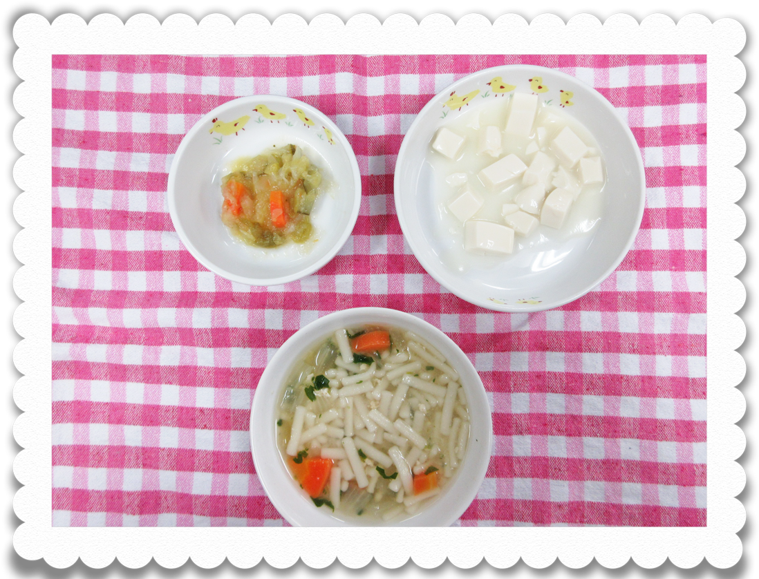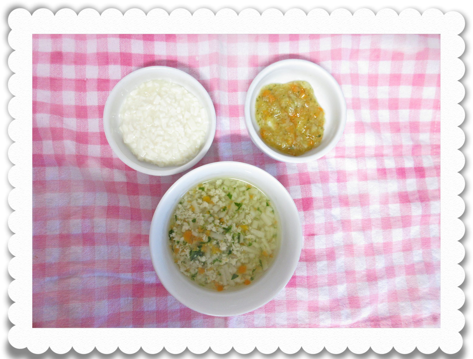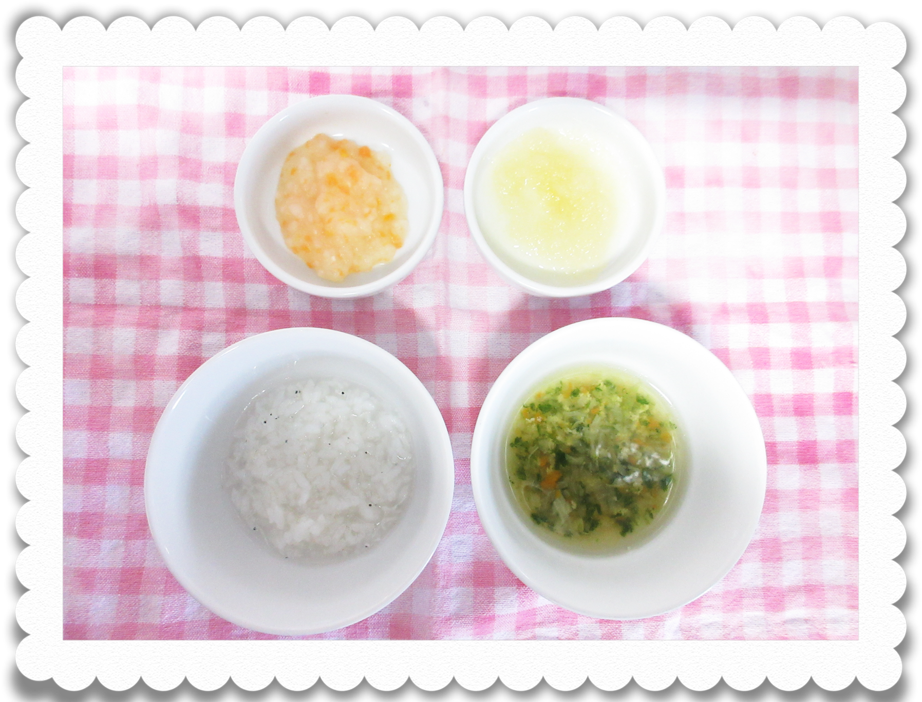 午後食:しらす粥、じゃが芋のつぶし味噌煮、チキンスープ、果物
