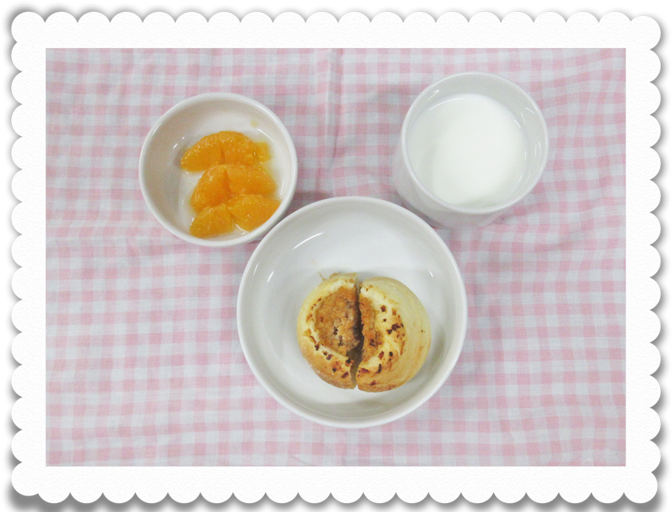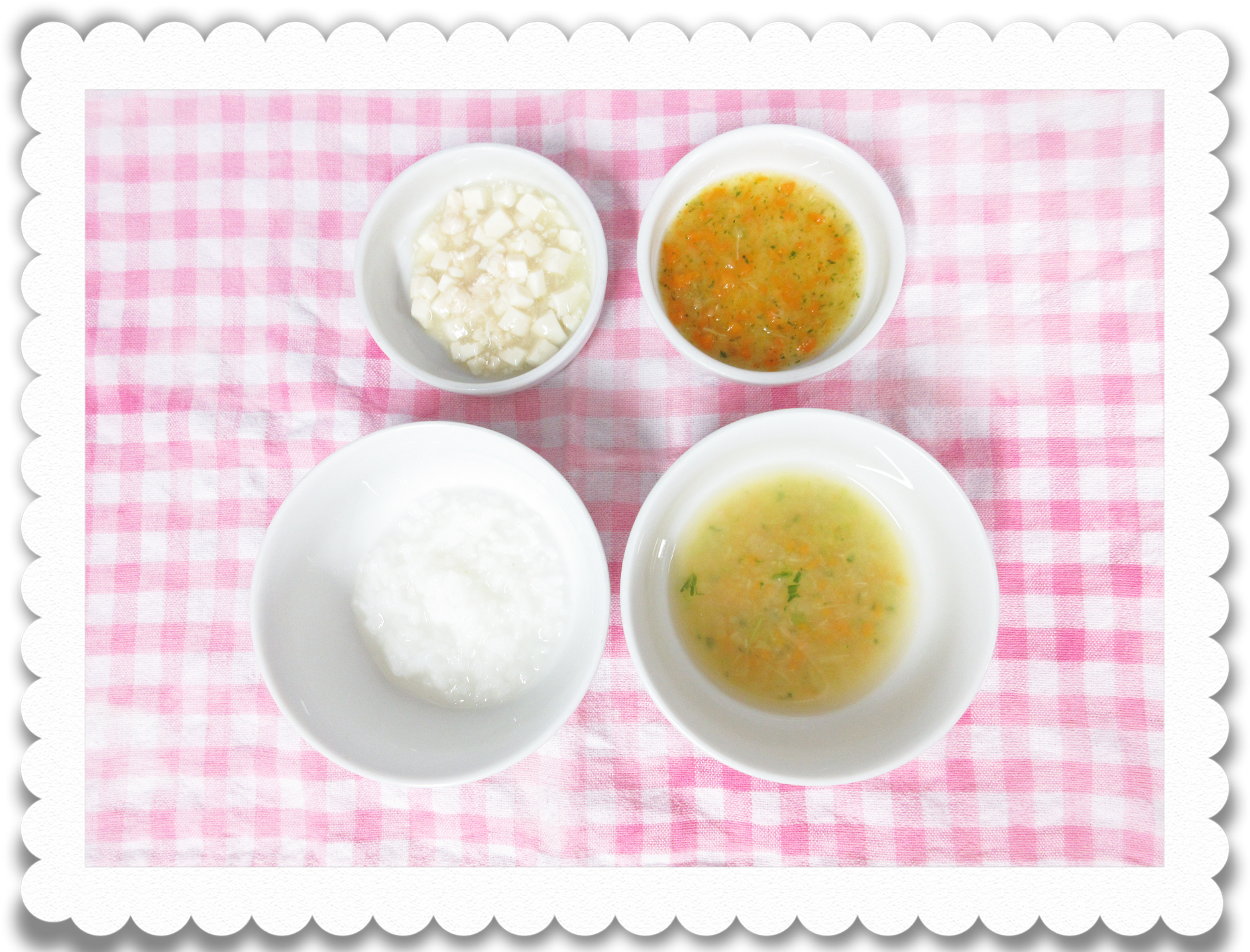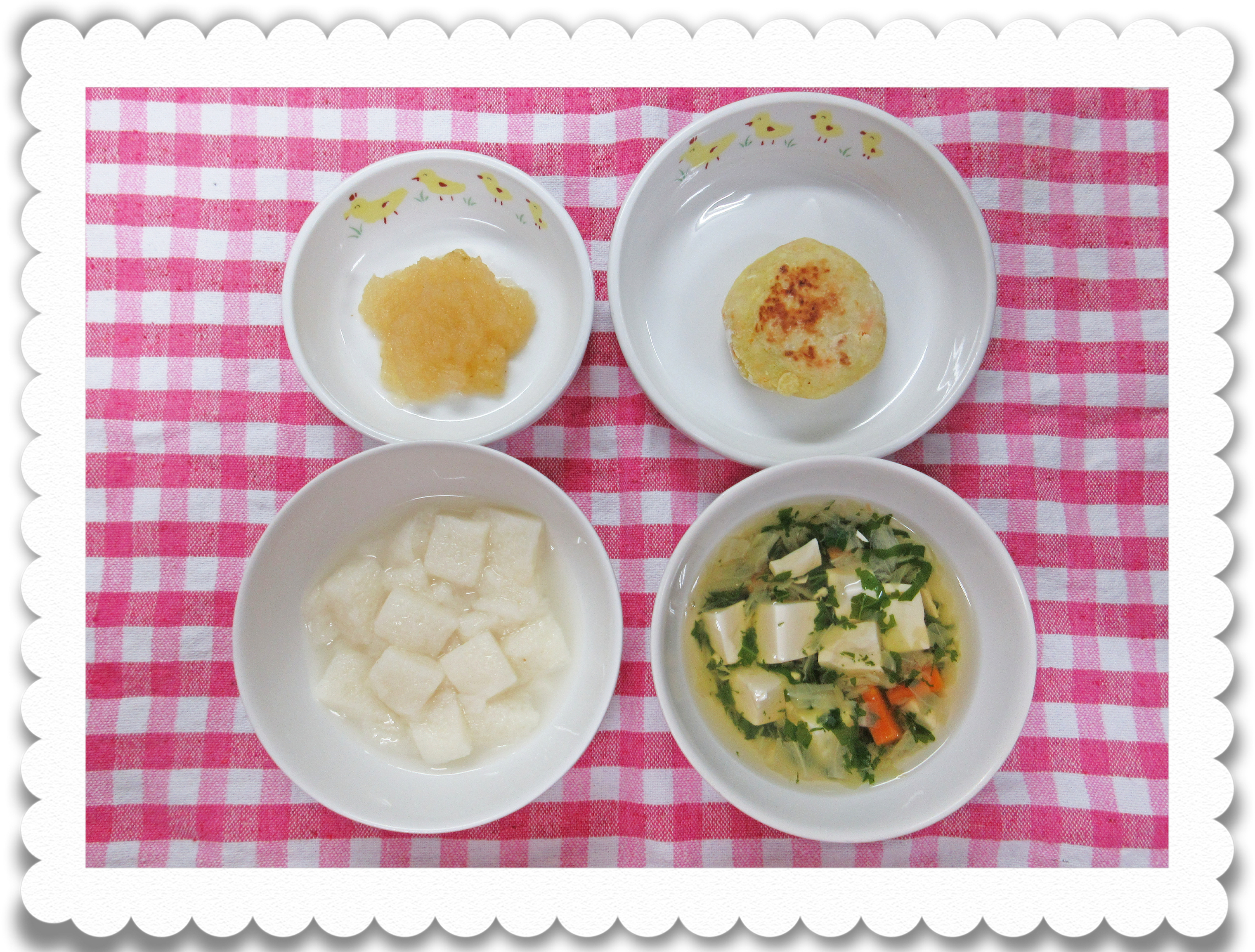午後食:スープパン粥、さつま芋のそぼろ煮、豆腐スープ、果物