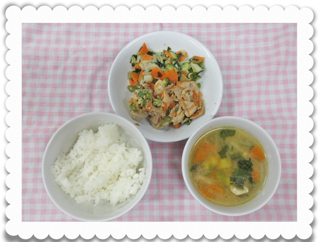 【幼児給食】ご飯、ゆで豚のごまみそ煮、和風サラダ、さつま汁