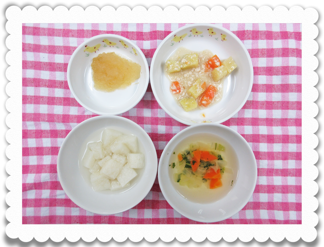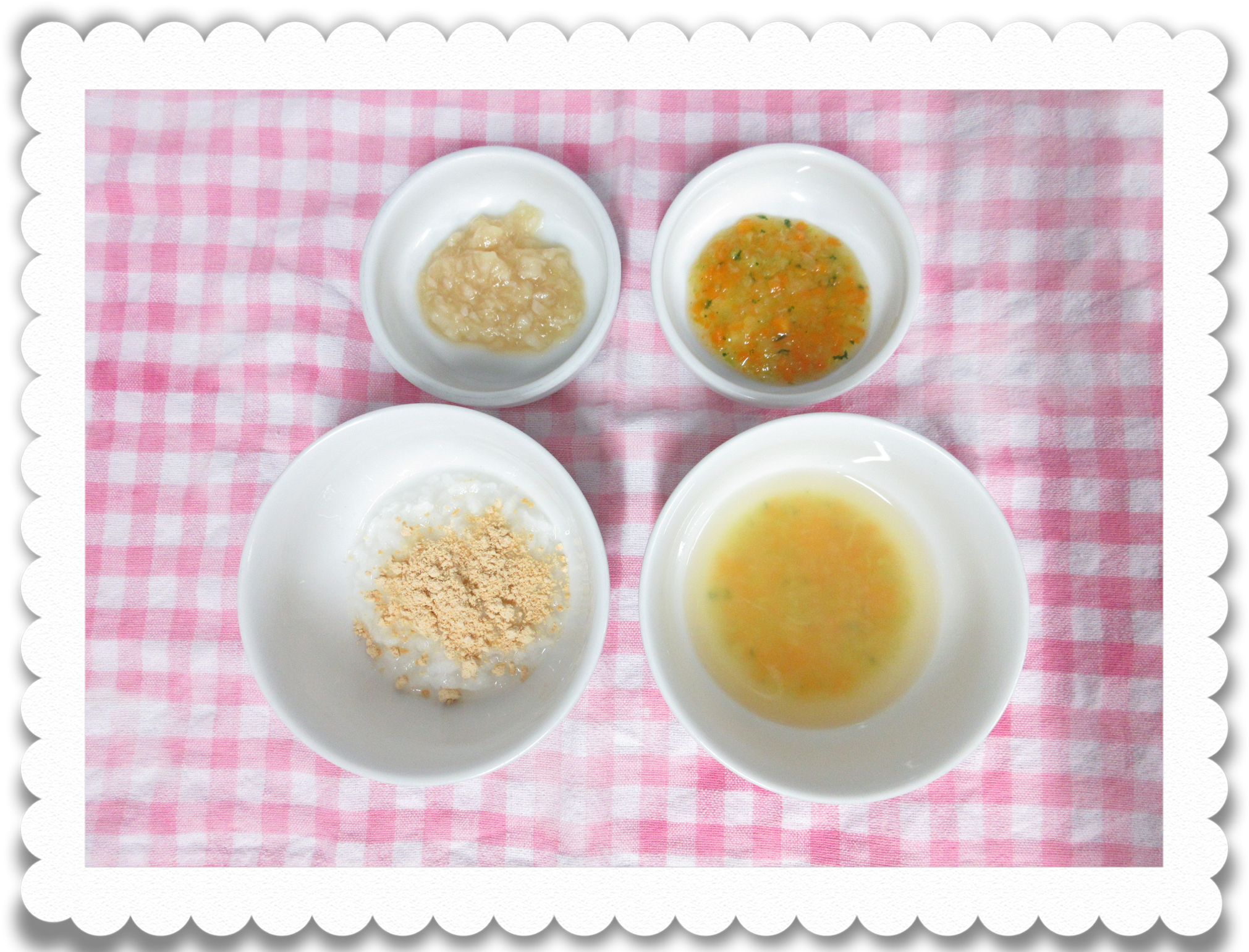 午前食:10倍粥、白身魚のペースト、野菜のうらごし、人参スープ