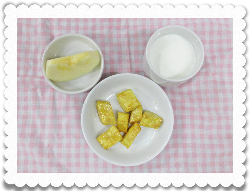午後食:スープパン粥、さつま芋のつぶし煮、野菜スープ、果物