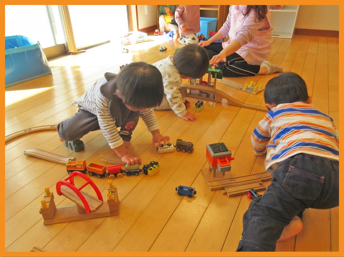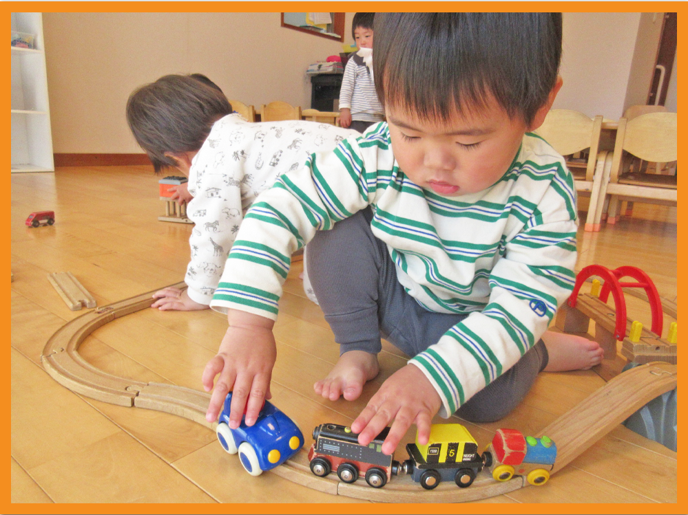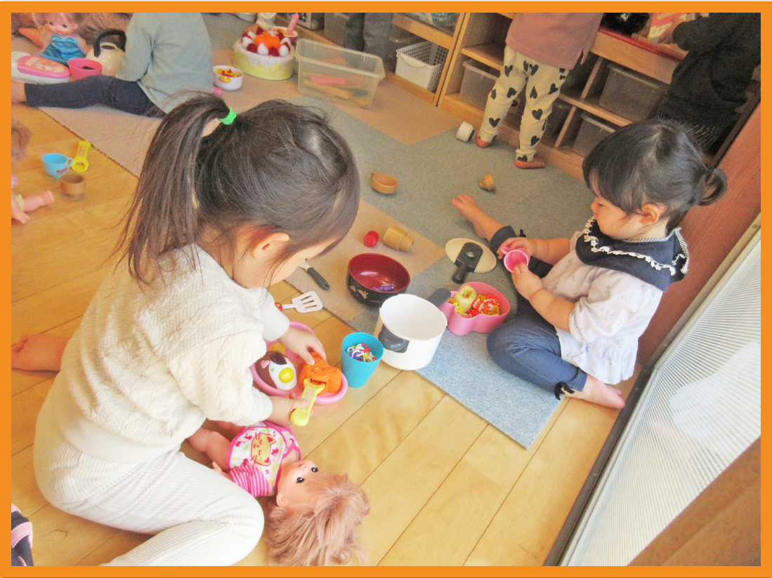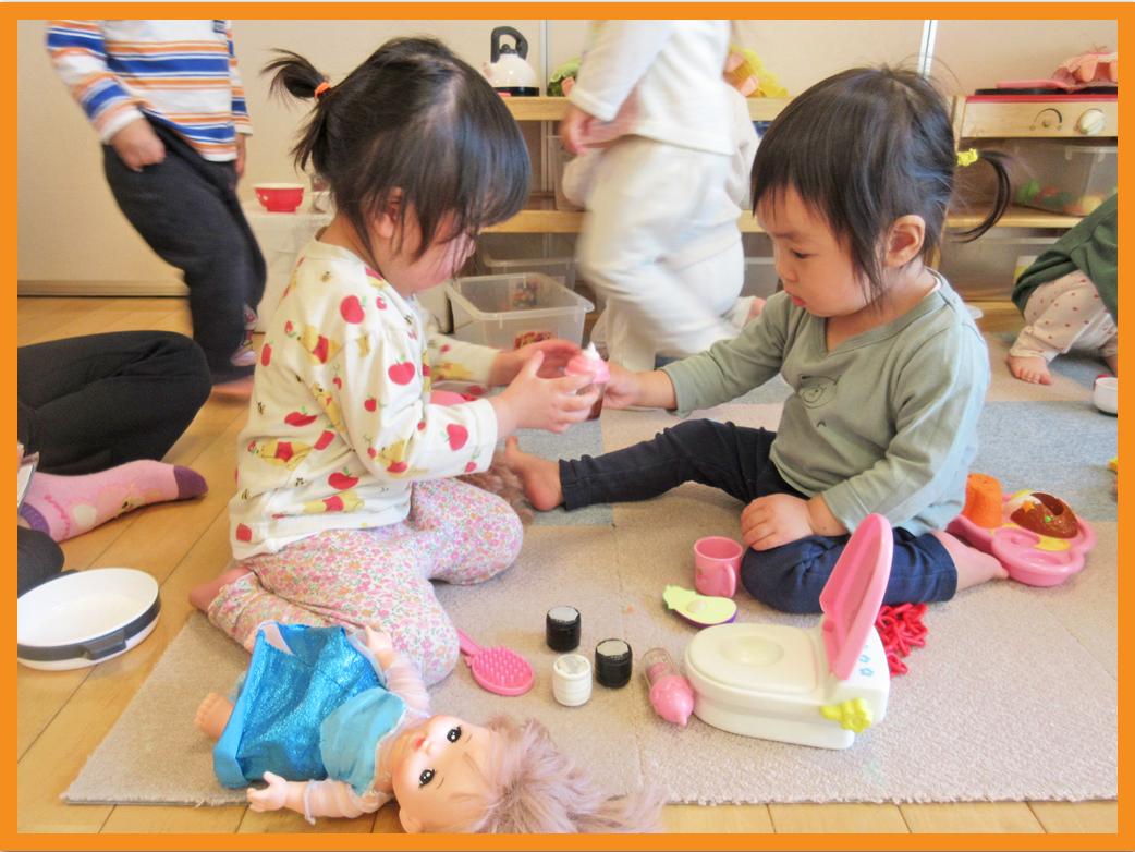 おままごとでは、「メルちゃんミルク飲んでいるの」のとお世話をしたり、お弁当箱に人参などの玩具を入れ「はいどうぞ~」とごっこ遊びしたりしました。