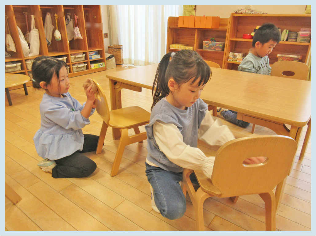 椅子を拭く際には「いつも僕たちを支えてくれてありがとう」や「こんなに真っ黒になるまで頑張ってくれていたんだね」と思いやりの心をもっているこどもたちの発言に、なんだか胸が熱くなりました。