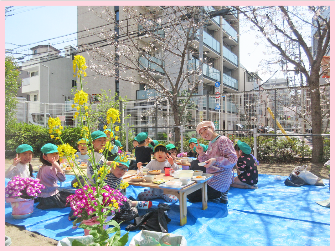 今日はたっぷり鮫洲公園で遊んだ後、園庭で給食を食べました。10年前の開園時に植えた桜も咲き始め、みんなが卒園していくことをお祝いしてくれています。