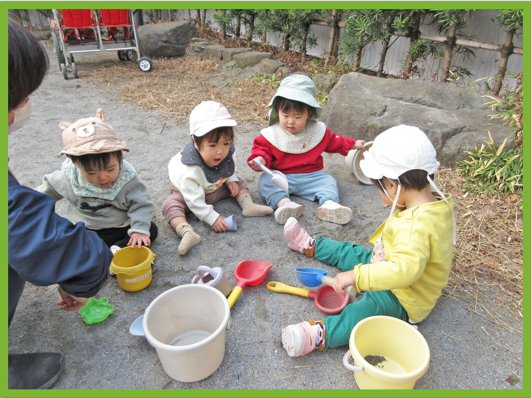 砂遊びでは玩具を共有しながら仲良く遊ぶ姿が見られ、お友だちとの関わりを楽しんでいる様子でした。砂の感触を手で楽しむ姿も見られ、指先を器用に使いながら砂をつまんでバケツに入れる姿が見られました♪