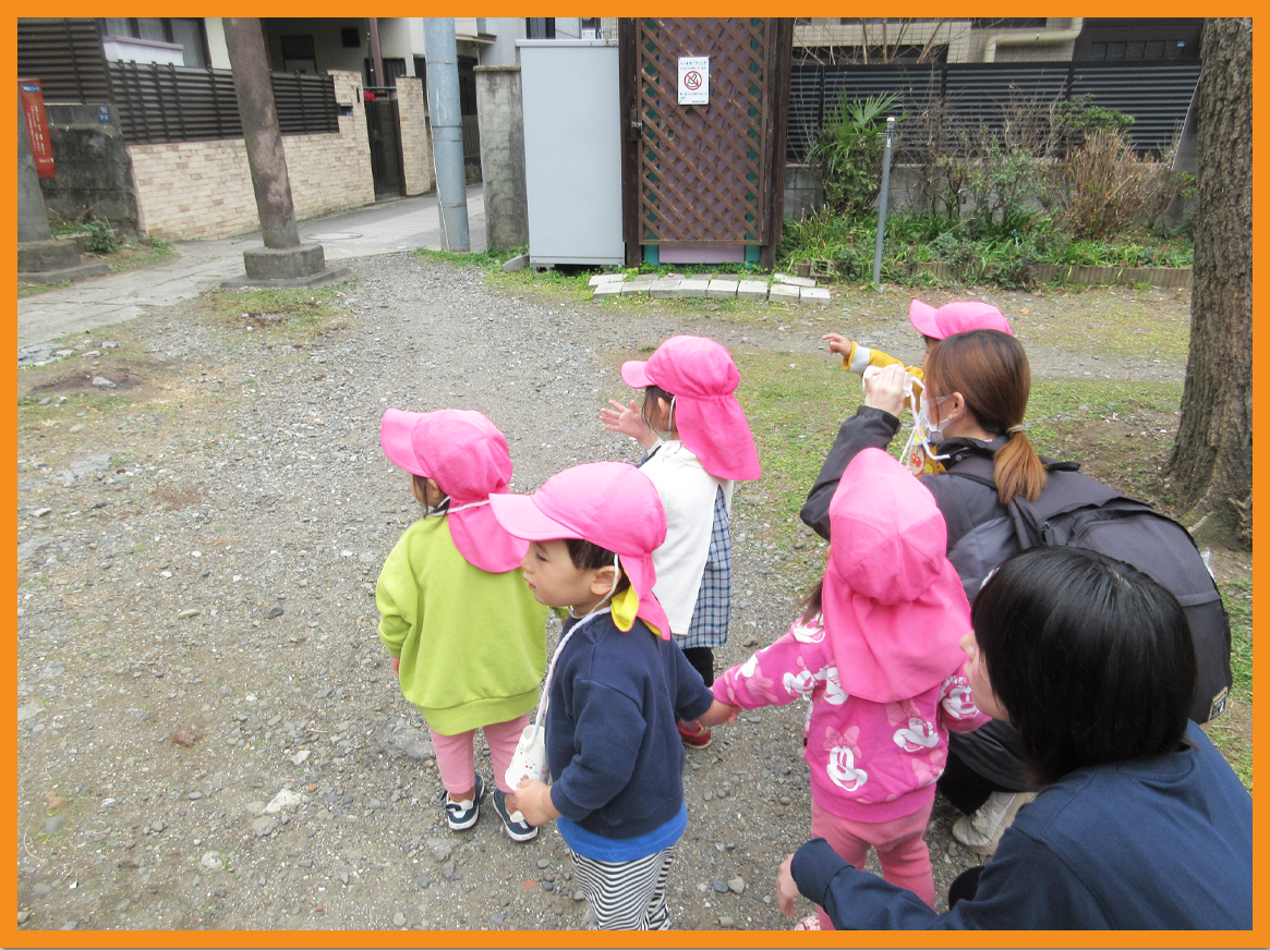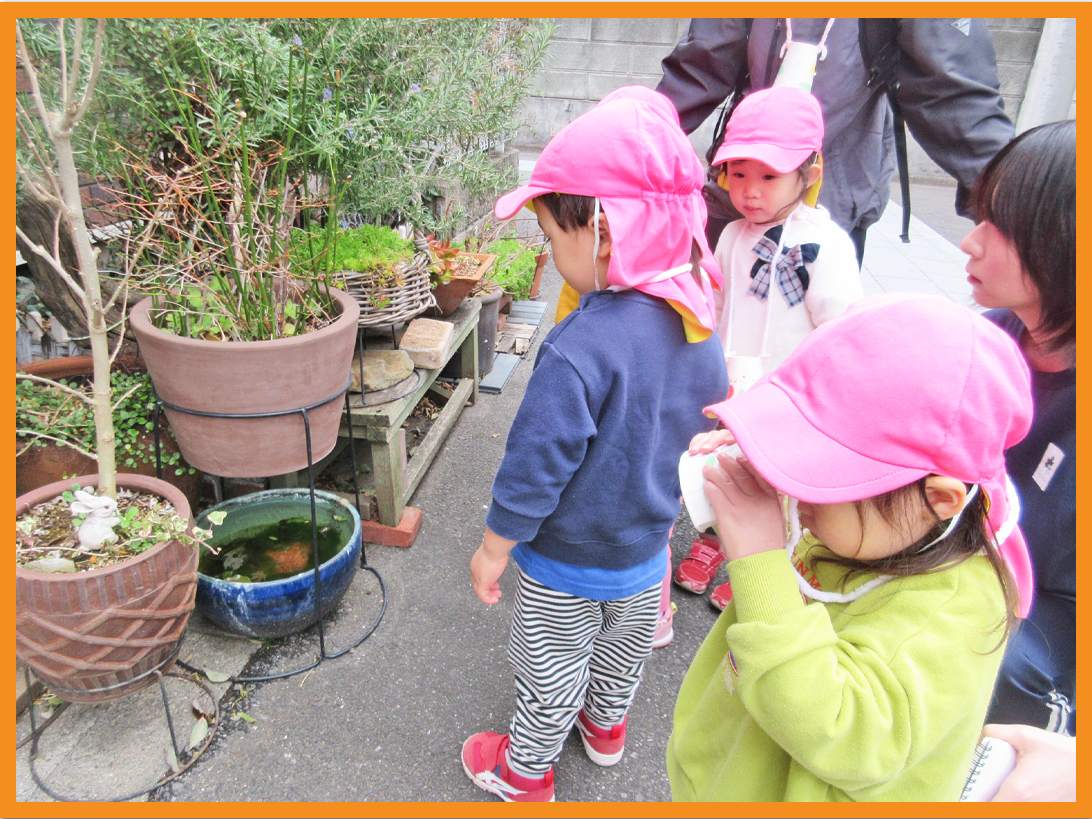 近所のお宅のお花を眺め、メダカ、電車を眺め、諏訪神社の猫に手を振って帰園しました。