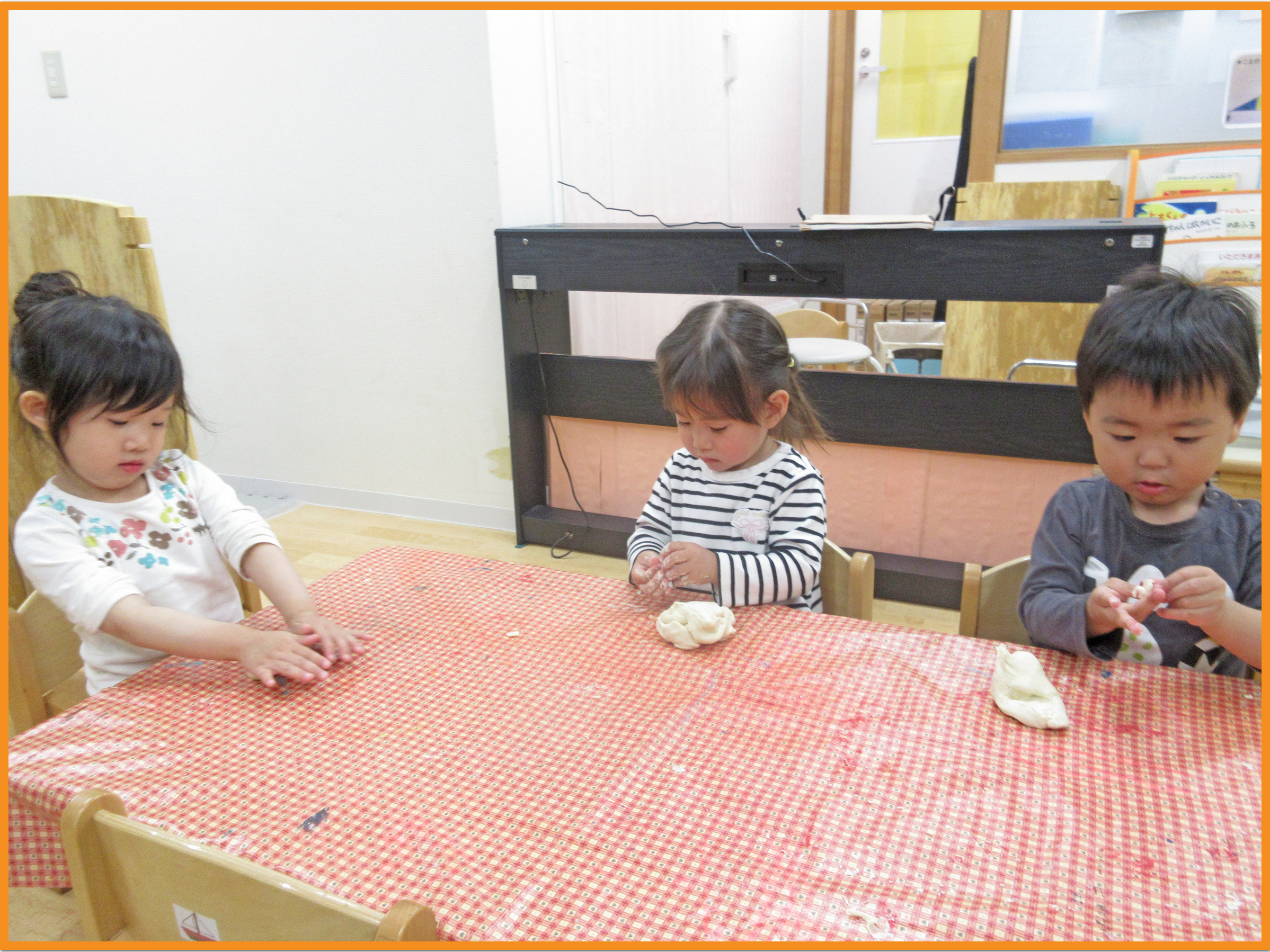 小麦粉粘土を渡すと、「餅みたいだね」「冷た~い!」と感触を言葉にしていました!