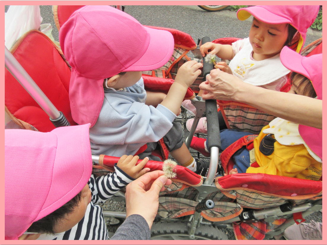 あひる組さんは今自分で歩くことが楽しい!と感じている子が多く、公園内でもバランスをとりながら一生懸命歩いてくれています。その中で引きずるとガラガラと音が出るおもちゃが楽しいようで一生懸命歩く子や、歩くのが既に上手な子は走って音が出る音を大きくし、それぞれの楽しみ方を楽しんでいました。道端を見るとタンポポが沢山咲いており、今日はその中で綿毛を拾って皆で探索しました。保育者がふーっと息をかけると飛んでく綿毛に驚きを見せてくれる顔がとてもかわいらしかったです。