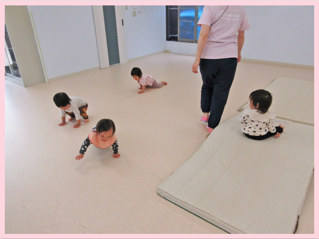 マットの山を登って下る、大きなホール内にダイナミックに走り回ったり、大きな円をえがきながらハイハイしてくれたりして、身体を沢山動かしていました。