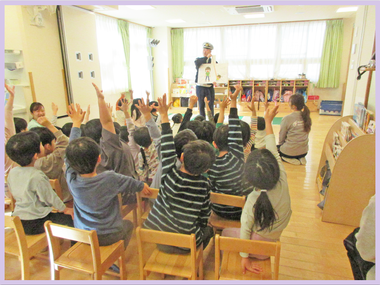 品川警察署の警察官の方々に交通安全のルールについて、振り返りながら、紙芝居を使ってお話をしてもらいました。