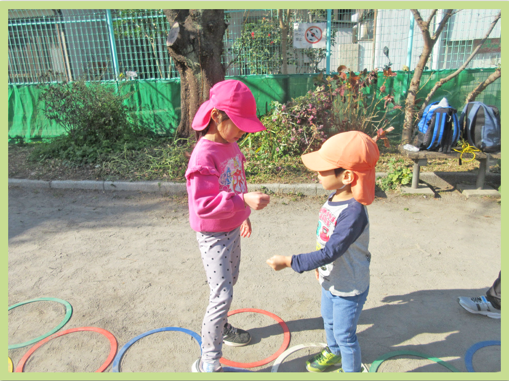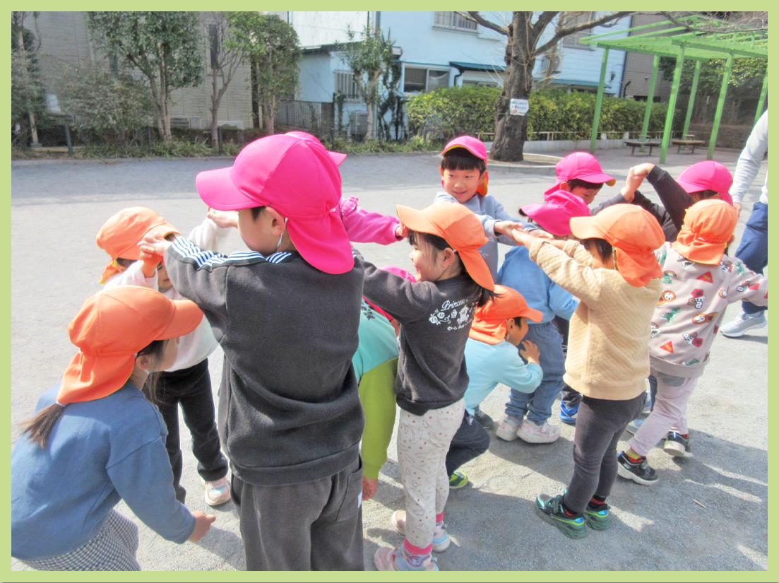 まずは5歳児クラスとの活動の様子です。一緒にどんじゃんけんや手繋ぎトンネルをして関わりを楽しみました。