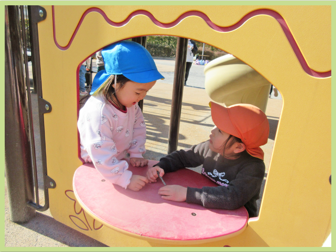 また、2歳児クラスとも合同で散歩に行きました。遊具を一緒に使ったり、お店屋さんごっこを楽しんだりする姿がありました。