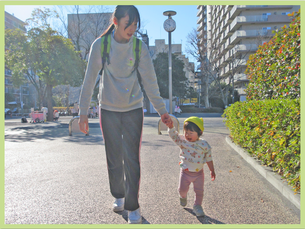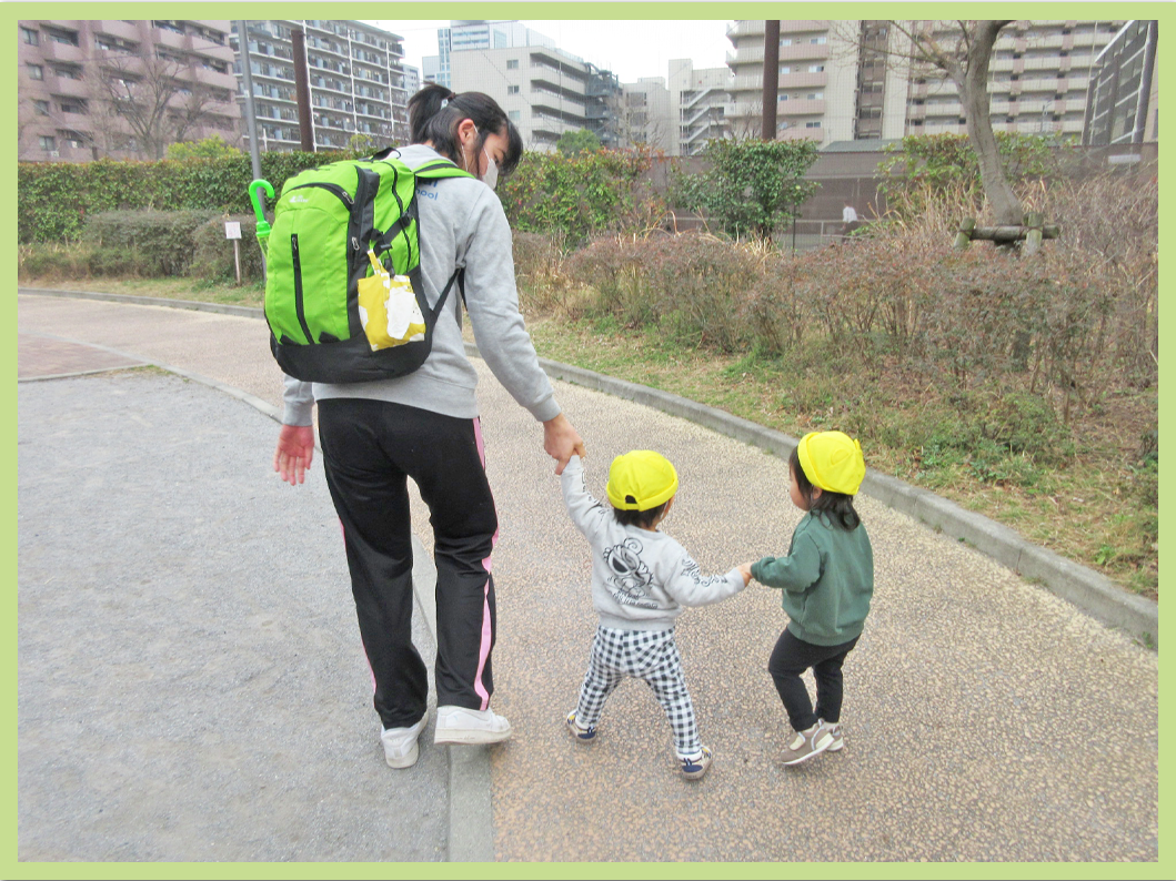 少しずつお友だち同士で握れるようになり、公園やお部屋の中を歩けるようになってきています。