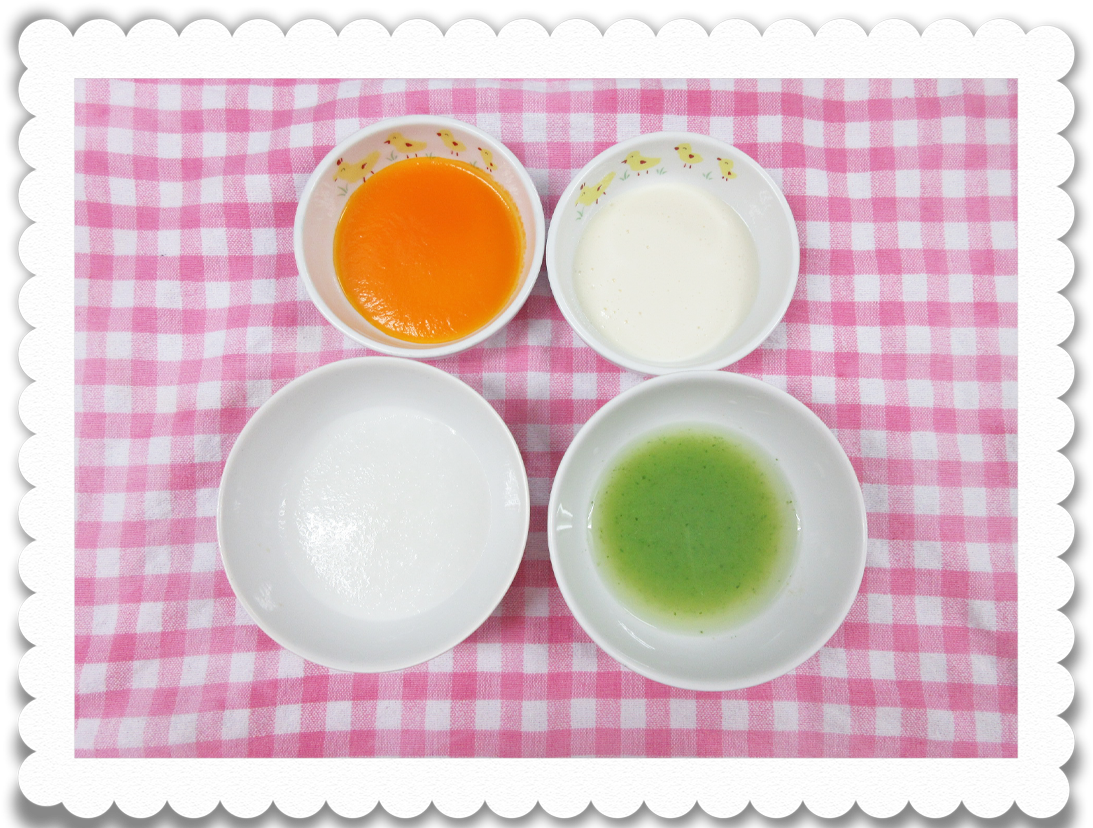 午前食:10倍粥、すり豆腐、人参と玉ねぎのうらごし、野菜スープ