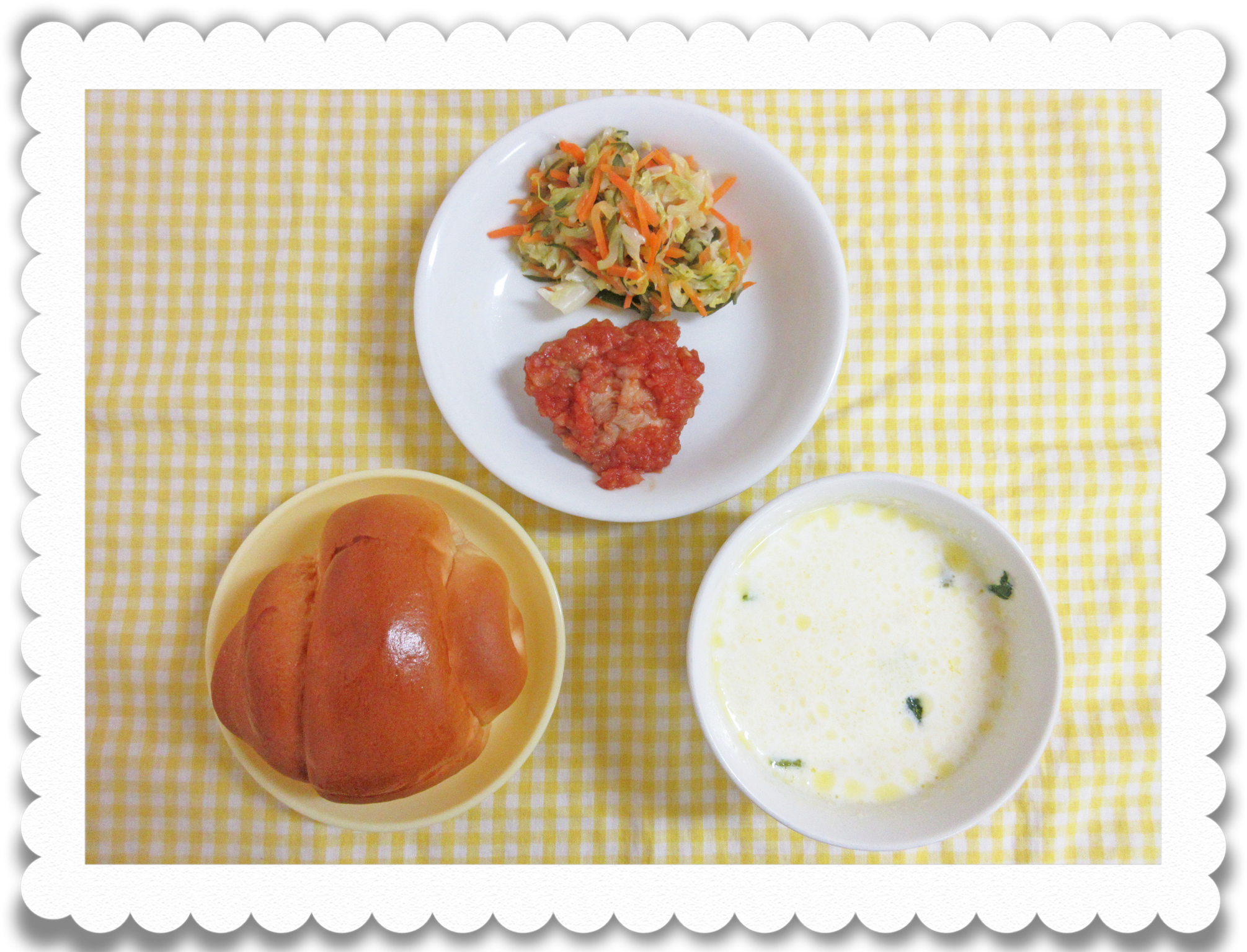 【幼児給食】バターロール、鶏肉のもみじ焼き、コールスローサラダ、ミルクスープ