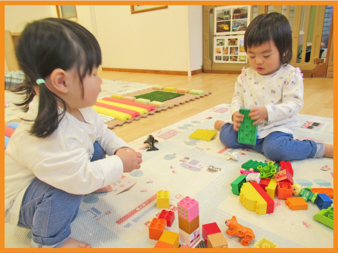 先月辺りから移行に向けて、うみ組のお部屋でレゴブロックに触れる機会を作っていました。はじめは握るなどして感触を確かめたり、保育者のくっつけたブロックを外したりすることを楽しんでいましたが、少しずつくっつけ方を覚えて自分でくっつけて遊ぶ様子も見られるようになりました。