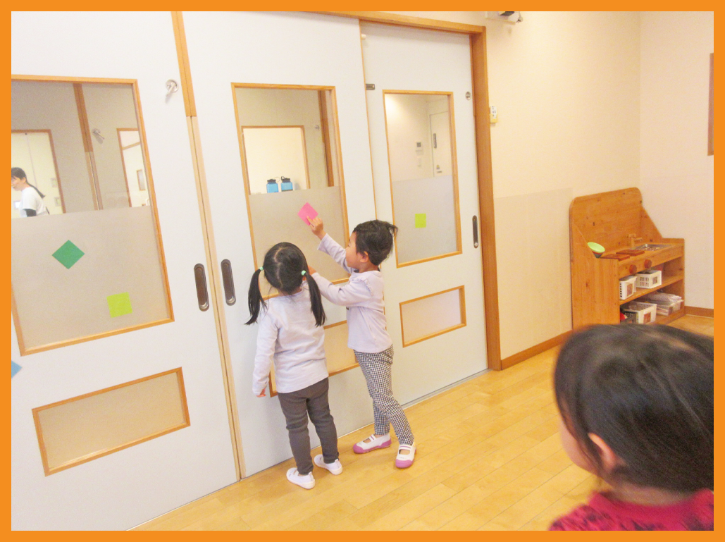 雨の日に室内でいろおにをしました。こども達と画用紙の色を確認した後、室内の壁や扉に画用紙を貼りいろおにの準備をしました。保育者が「いろおに、いろおに、○○色」と色を探す合図の言葉をいうと「どこにあるかな」「こっちかな」と言いながら色を探していました。色を見つけることができると「あった」と嬉しそうな声を出し、まだ見つけられていないお友達に「ここだよ」「あっちにもあるよ」と知らせてあげる姿も見られました。