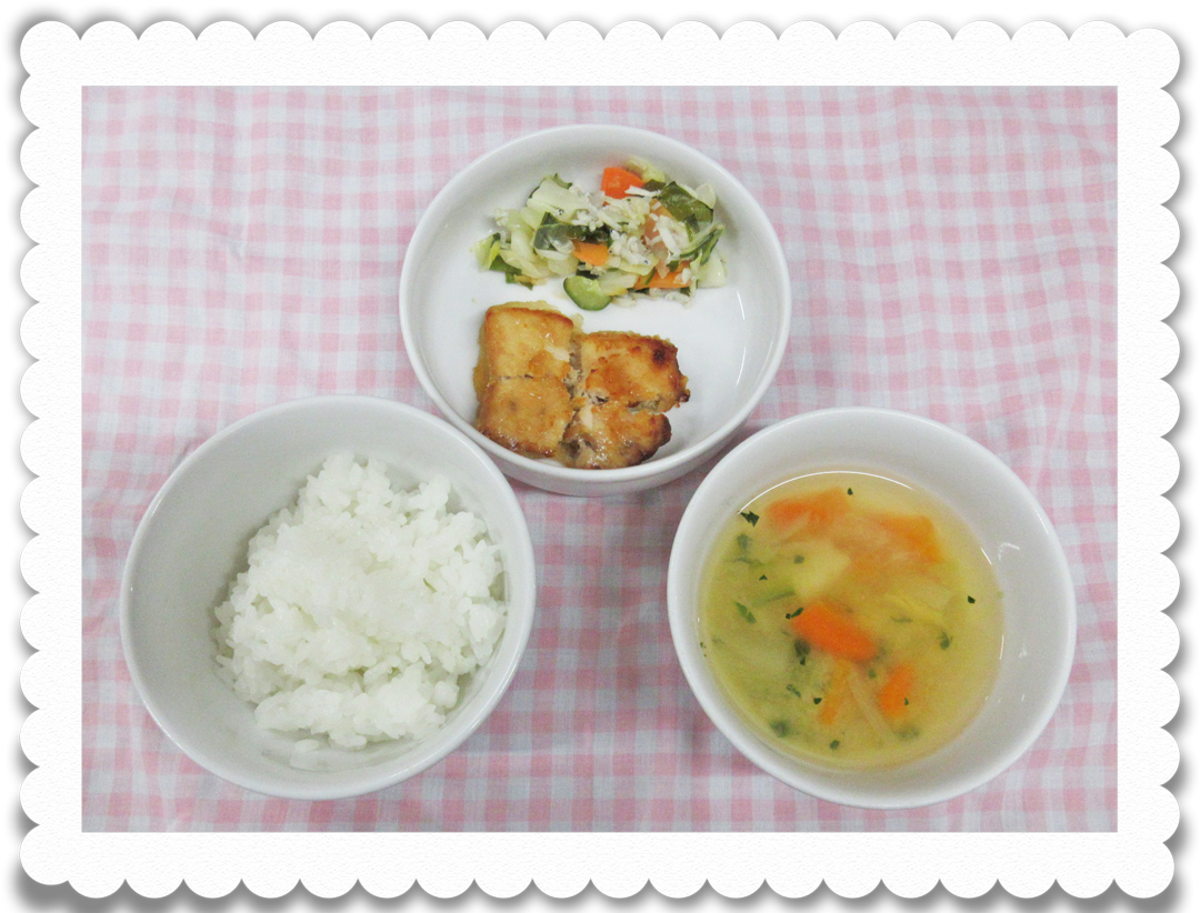 【幼児給食】ご飯、かじき鮪の竜田揚げ、わかめサラダ、みそ汁