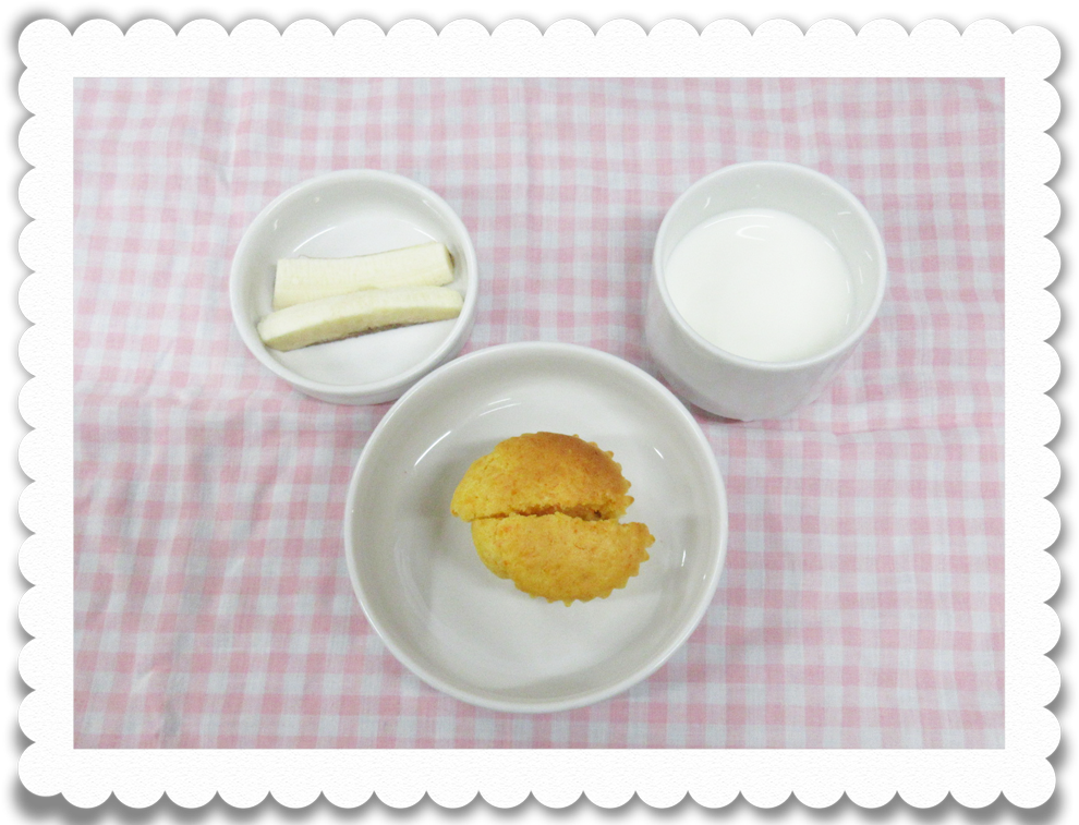 【幼児おやつ】牛乳、キャロットケーキ、果物