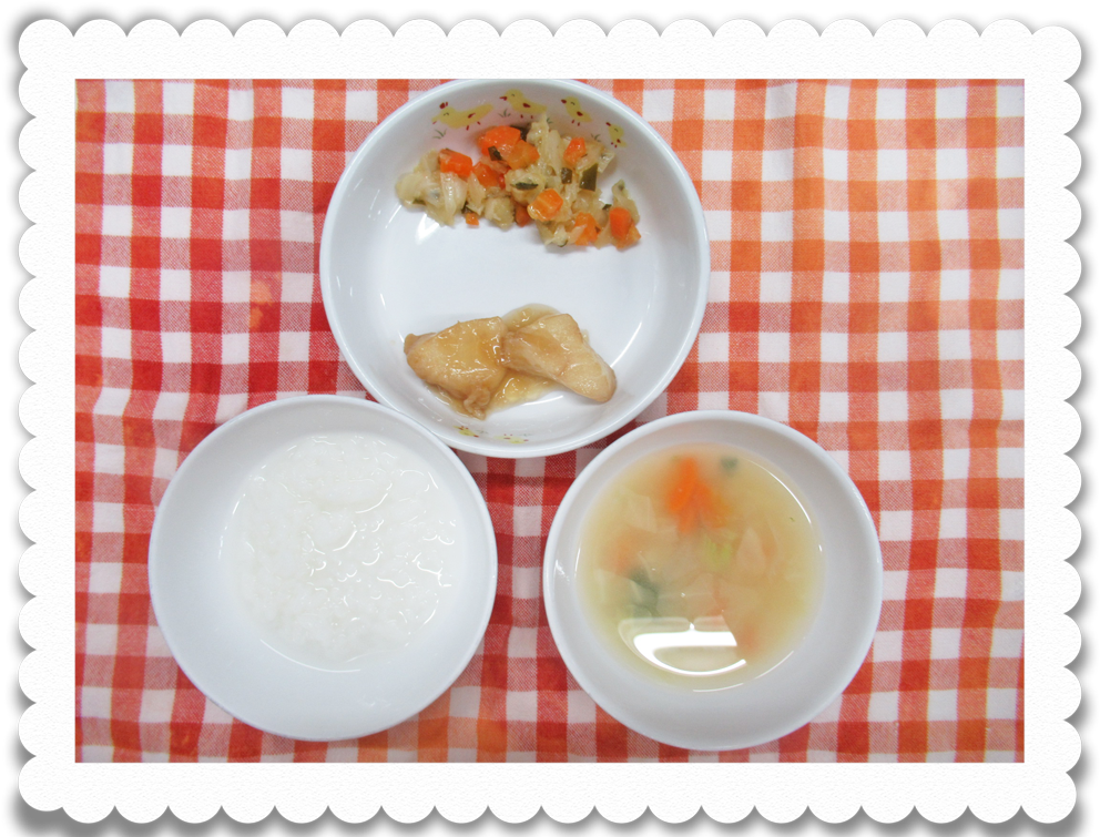 午前食:硬粥、白身魚の香味煮、和風あえ、みそ汁