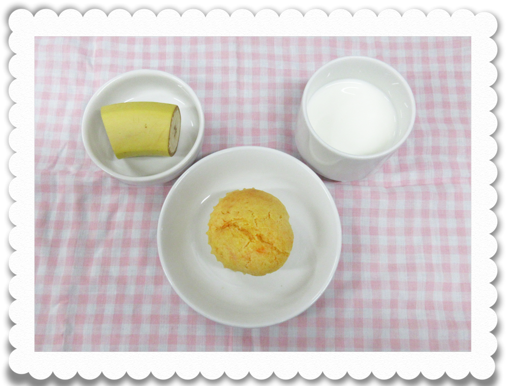午後食:牛乳、キャロットケーキ、果物