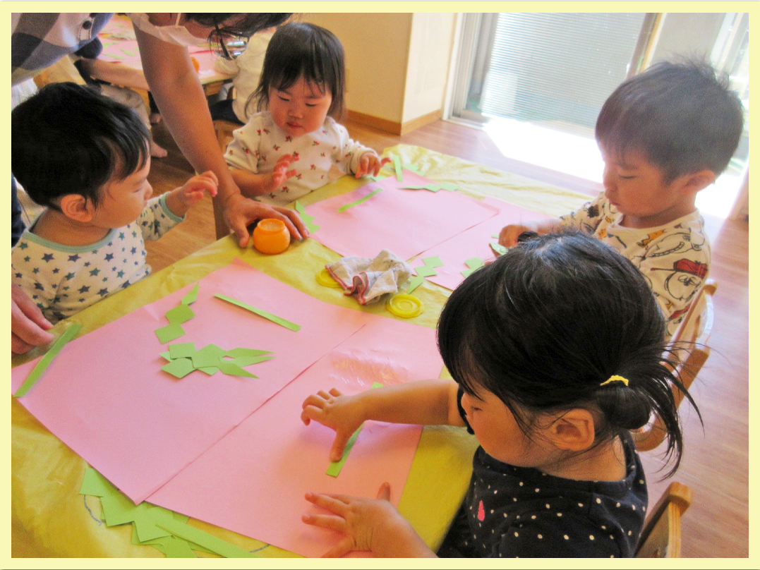 スズランテープを裂いたり、のりを使って台紙に貼ったりしました