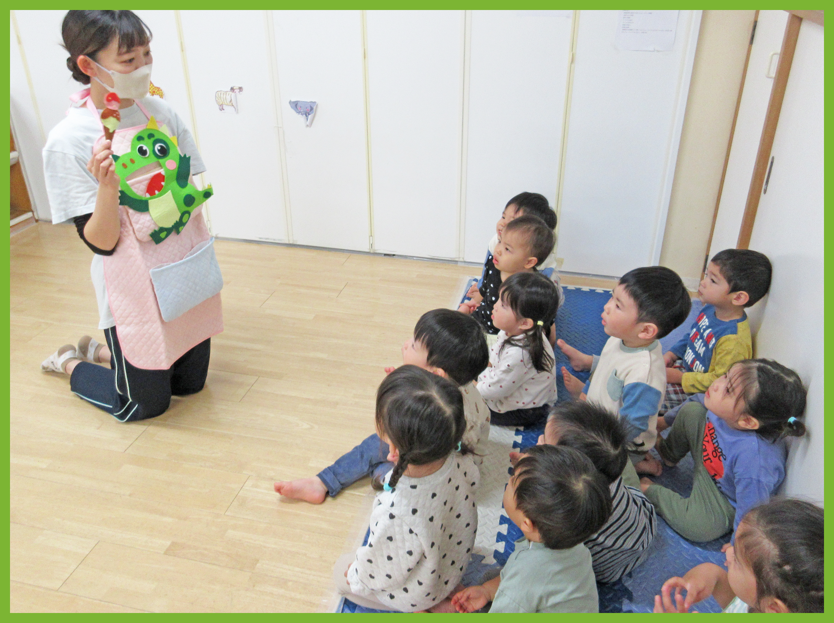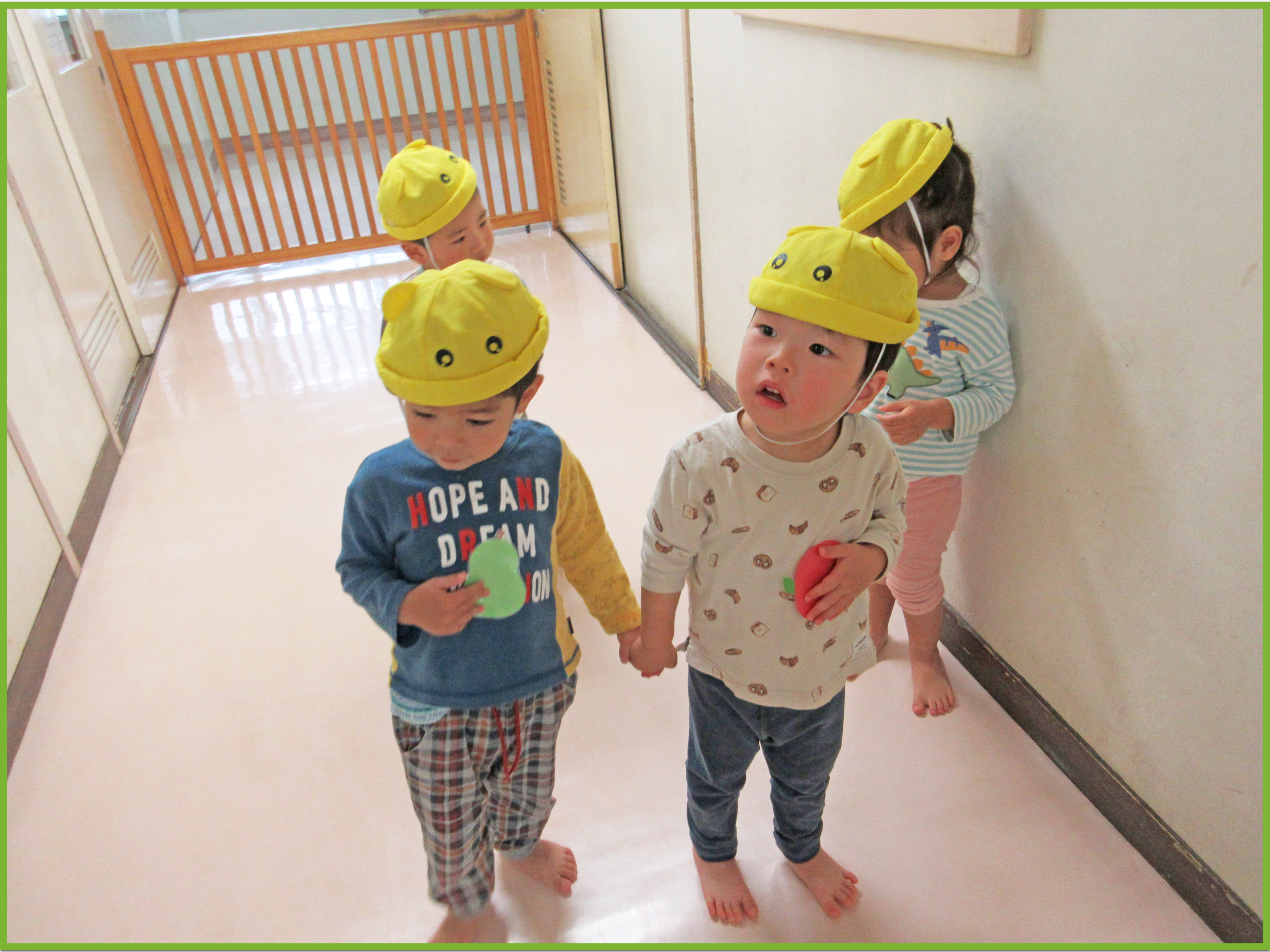 朝の会で怪獣が美味しい物を食べるエプロンシアターを楽しんでいたので、園内に食べ物を隠してみんなで園内探索をしました。