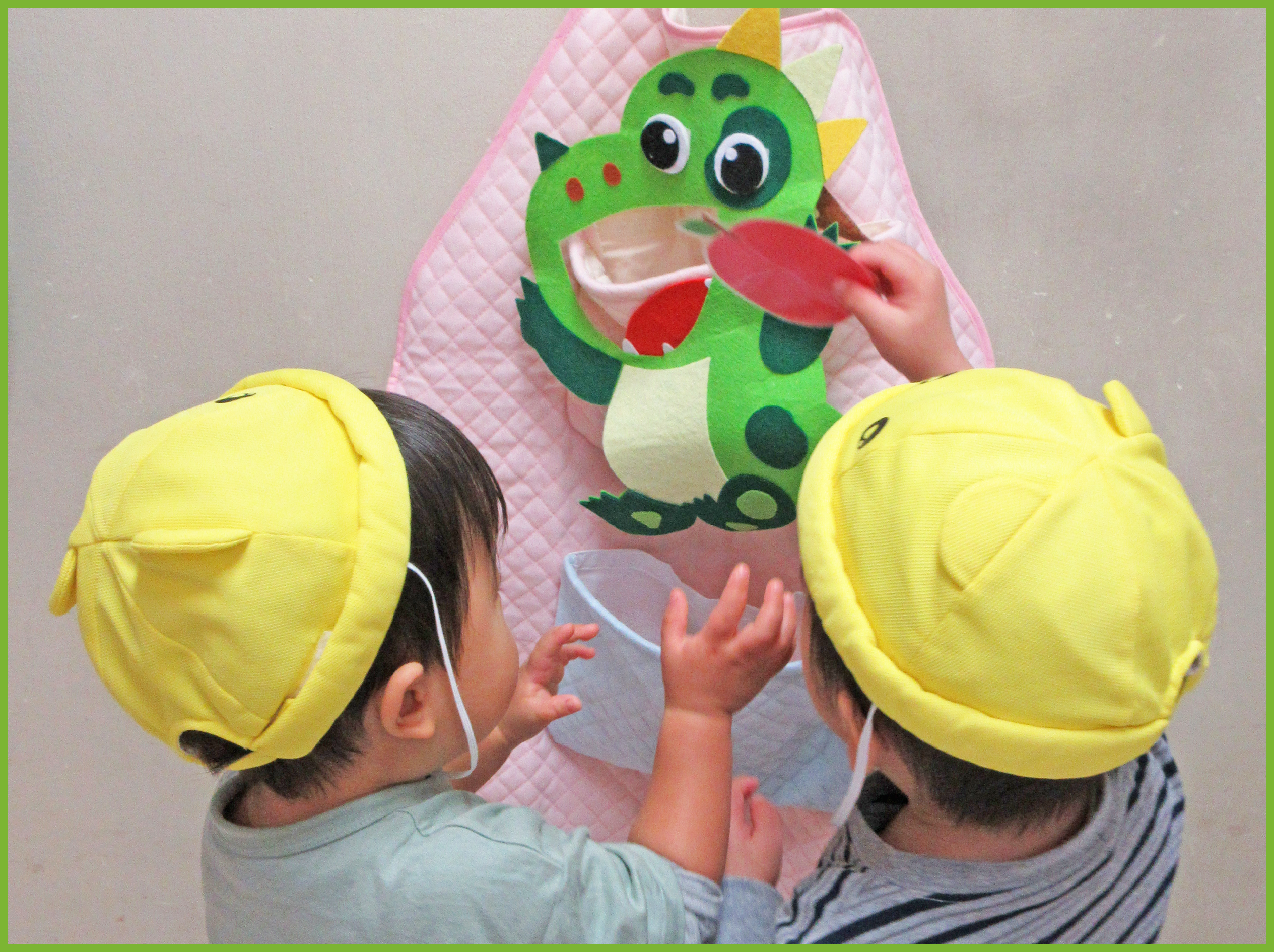 「いちごあったよ」「怪獣にあげようね」などと会話をしながらたくさん果物を見つけると保育者のエプロンについている怪獣に食べさせてあげていました。