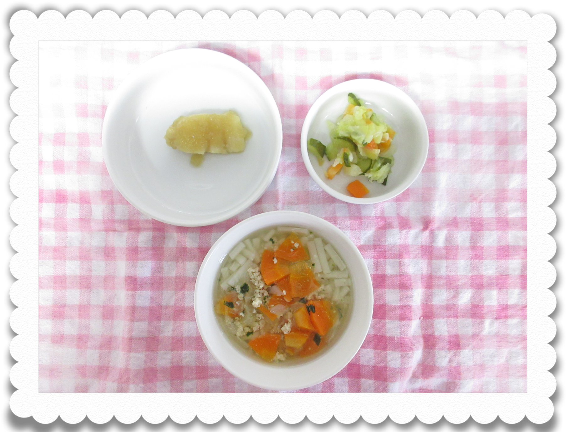 午前食:野菜うどん、白身魚のりんご煮、フレンチあえ