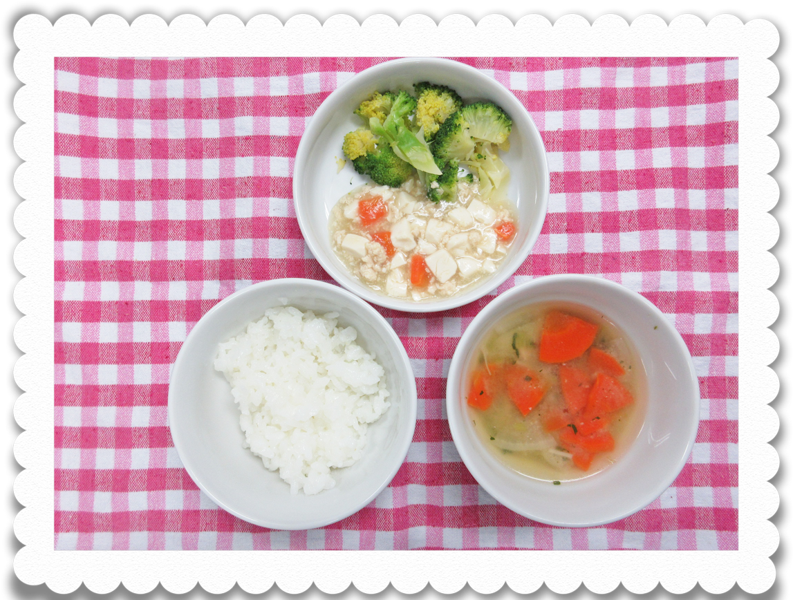 午前食:軟飯、豆腐のそぼろ煮、茹でブロッコリー、鶏汁