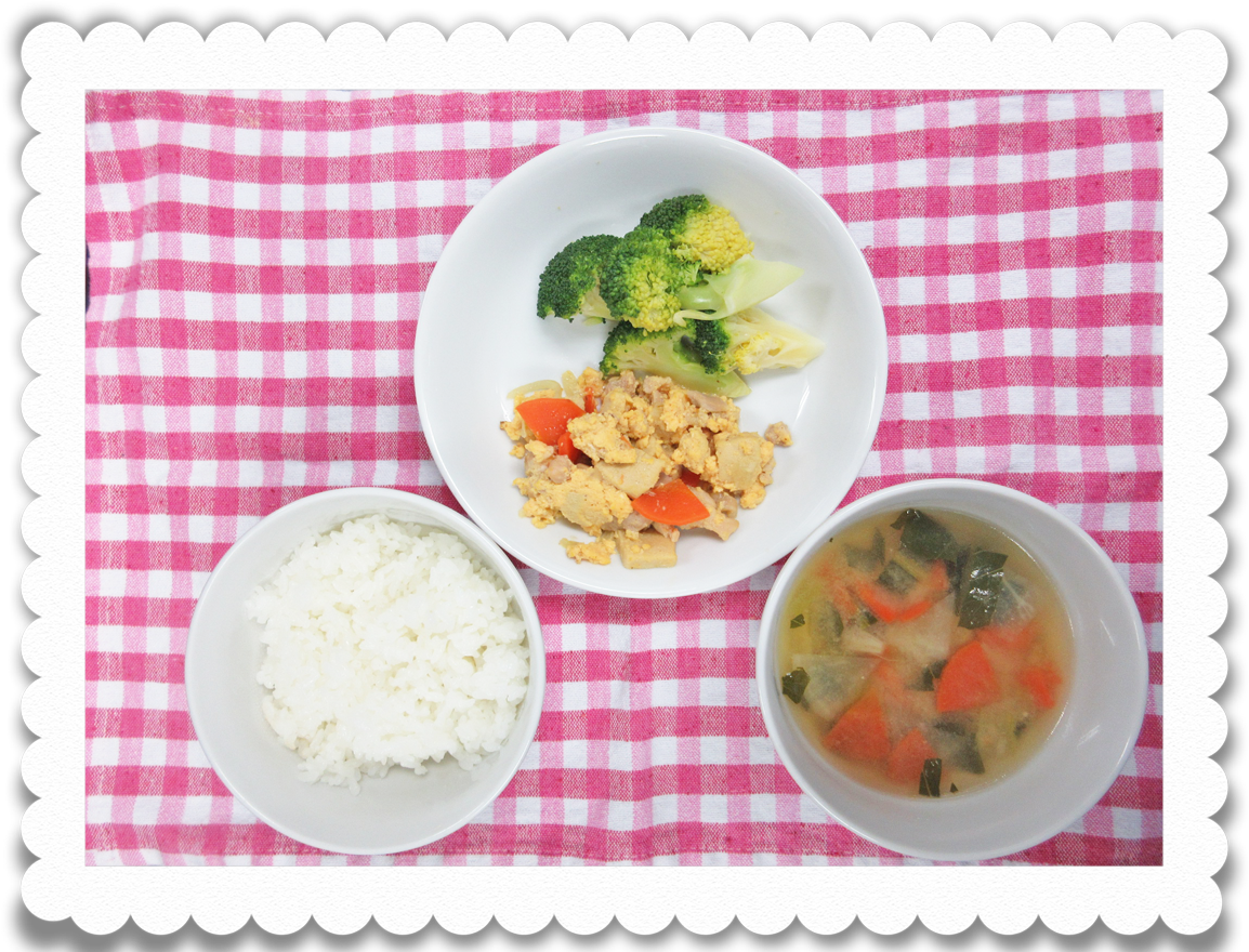 【幼児給食】ご飯、高野豆腐の卵とじ、茹でブロッコリー、鶏汁