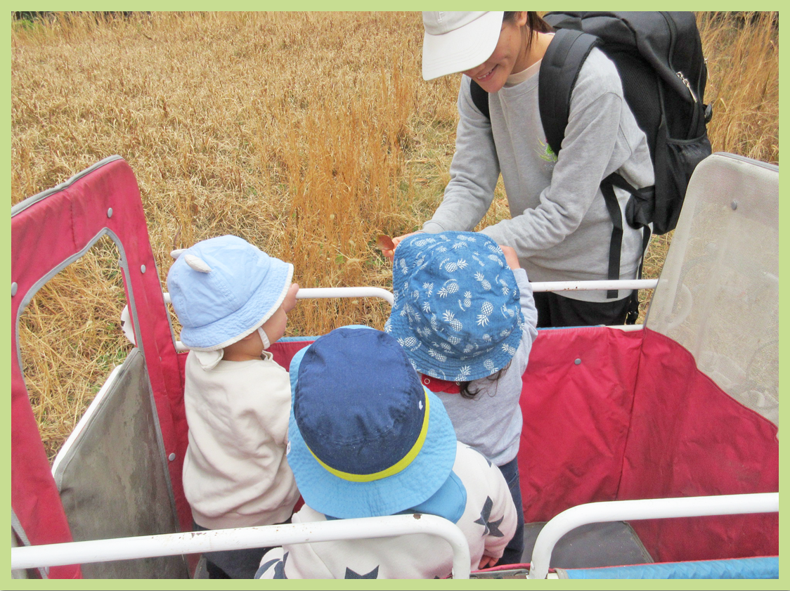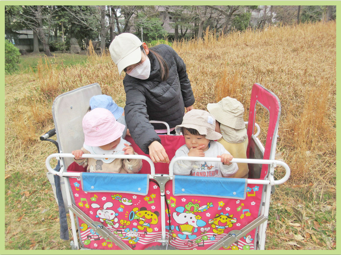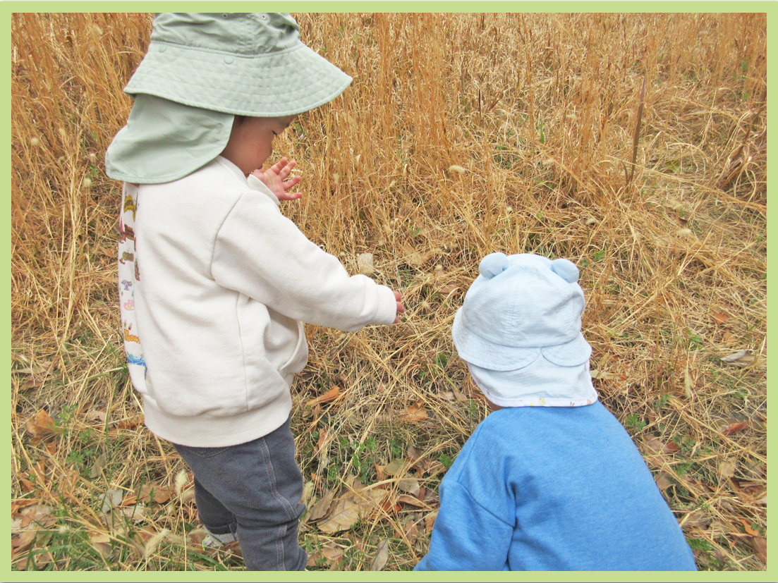 今日は都堀公園方面に散歩に出掛けました。落ち葉やねこじゃらしを見つけると、つついたり触れたりして感触を楽しんでいました。散歩先で避難訓練の連絡があり、状況の安全が確認されるまで公園で待機していましたが、落ち着いて過ごすことができていました。その後は、広域避難場所である平和の森まで行きました。